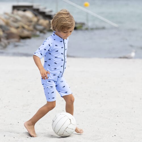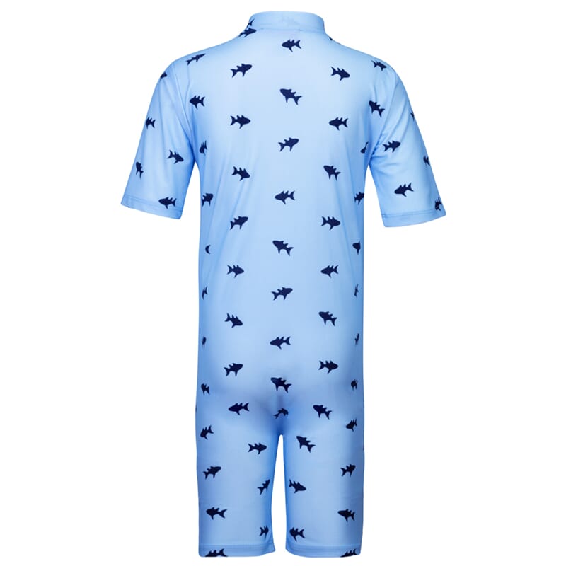 Lyseblå med mørkeblå fisker. Enkel åpning med glidelås. Tøyet har UV-beskyttelse 50+, noe som tilsier at kun 2 % av solens UV-stråler slipper gjennom. Badetøyet er svært elastisk og behagelig og av hurtigtørkende Øko-tex-stoff. Badetøyet er normalt i størrelsen, men vipp opp om du ligger mellom størrelser.