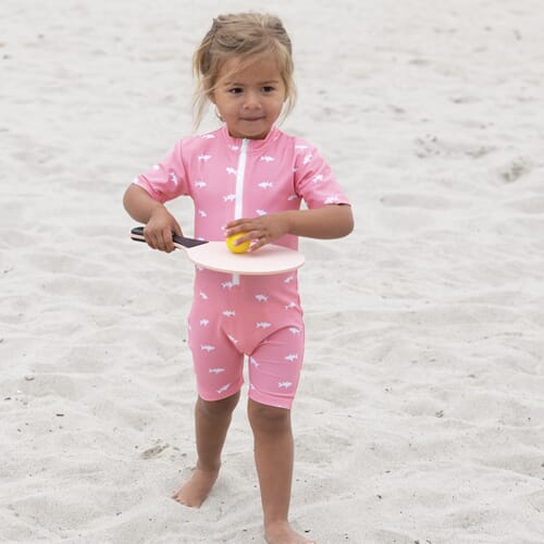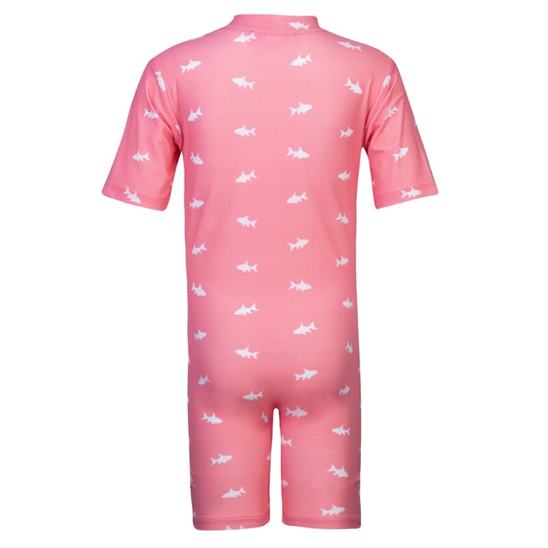 Rosa med hvite fisker. Enkel åpning med glidelås. Tøyet har UV-beskyttelse 50+, noe som tilsier at kun 2 % av solens UV-stråler slipper gjennom. Badetøyet er svært elastisk og behagelig og av hurtigtørkende Øko-tex-stoff. Badetøyet er normalt i størrelsen, men vipp opp om du ligger mellom størrelser.