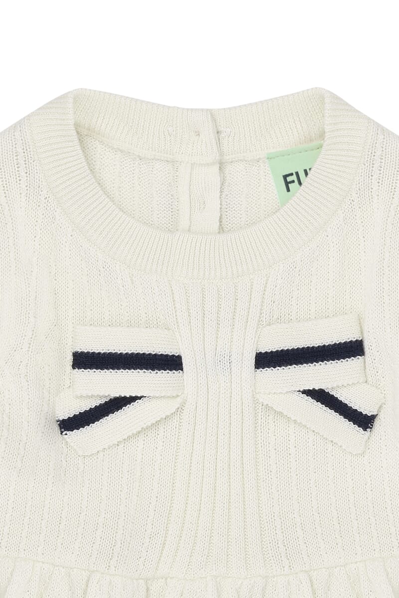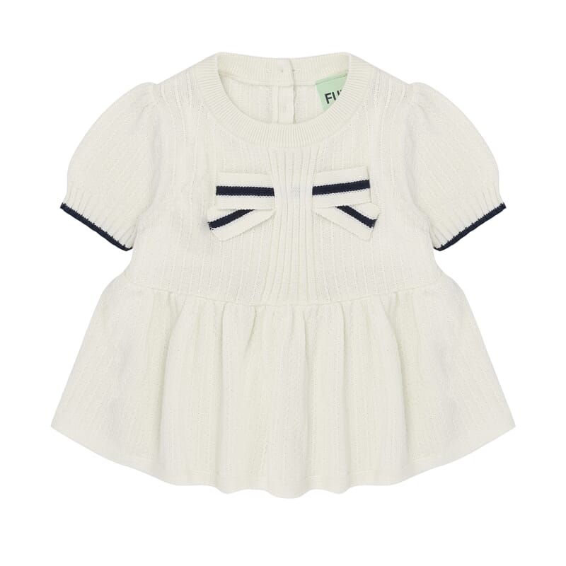 Nydelig kremfarget top med.dekorativ struktur i strikken. Deilig myk bomullskvalitet. Fine folder som gir volum til nederste del av blusen. Dekorativ sløyfe i front, puffermer, ribbestrikket kant i halsen, kontrastsøm langs ermene. Perlemorsknapping i ryggen. Kan fint også brukes som kjole om man går opp en størrelse.