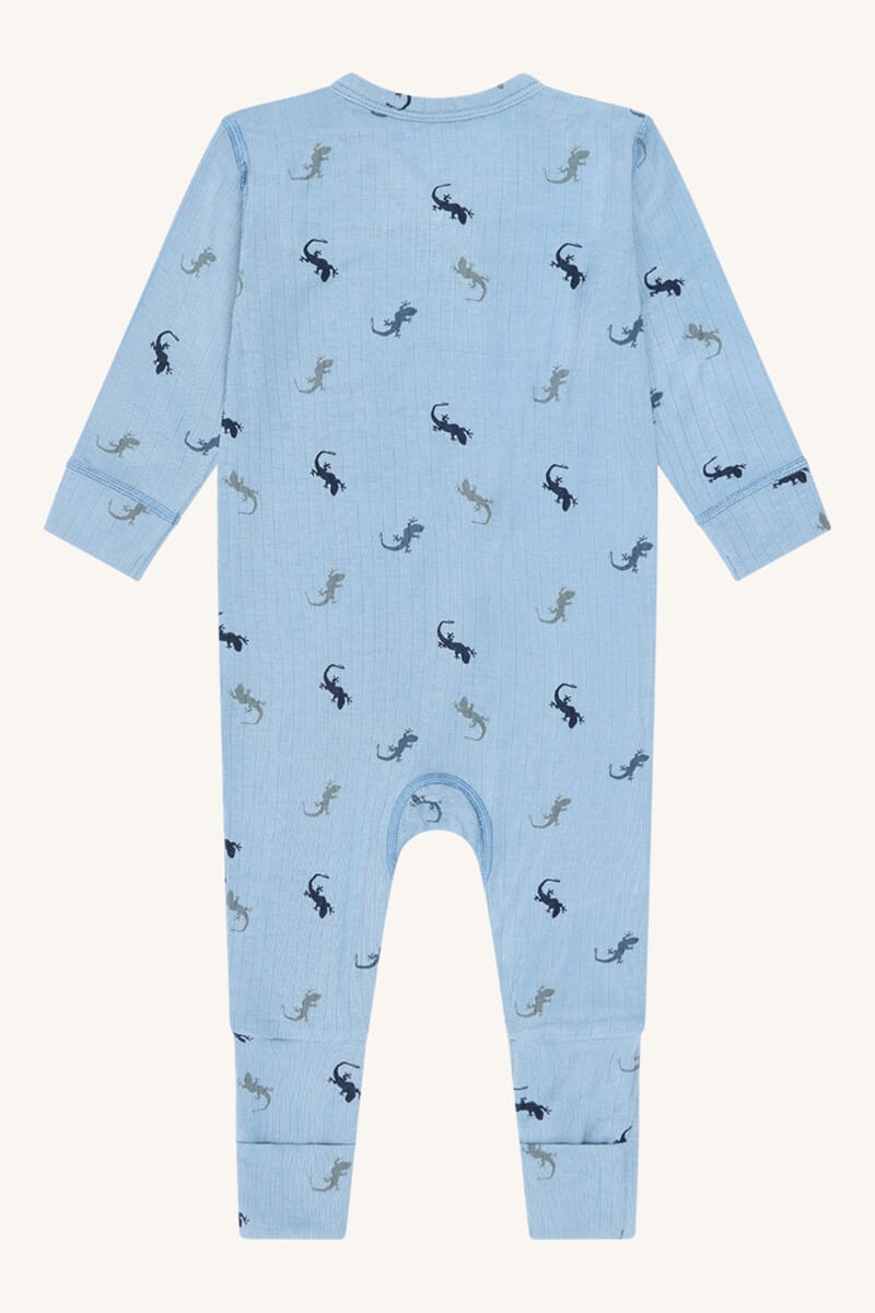 Langermet heldrakt med knapping i front. Søtt print av små øgler. God elastisk rib-kvalitet i deilig myk bambus.