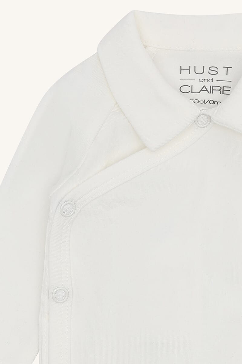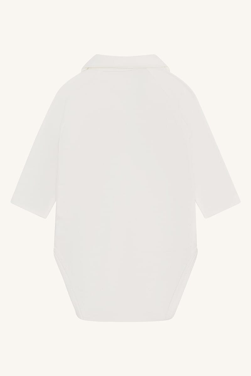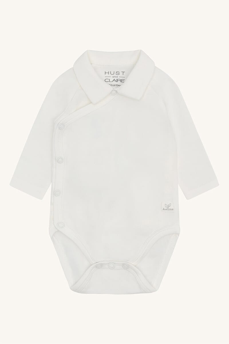 Hvit body i fin myk bomulllskvalitet. Omslagsbody med knappelukking på høyre side og mellom beina. Fin spiss krage.