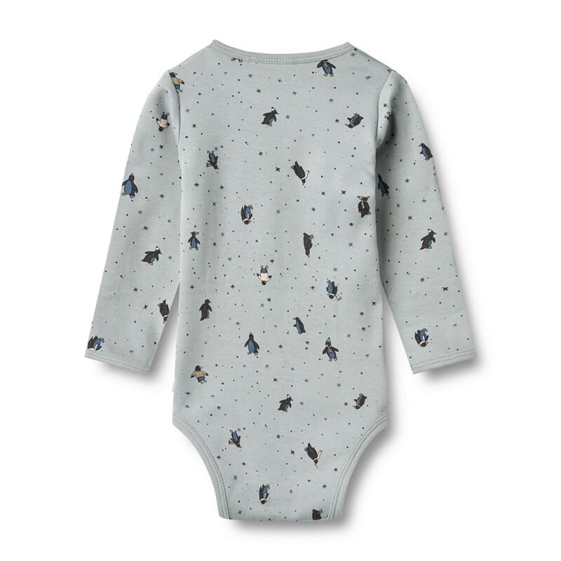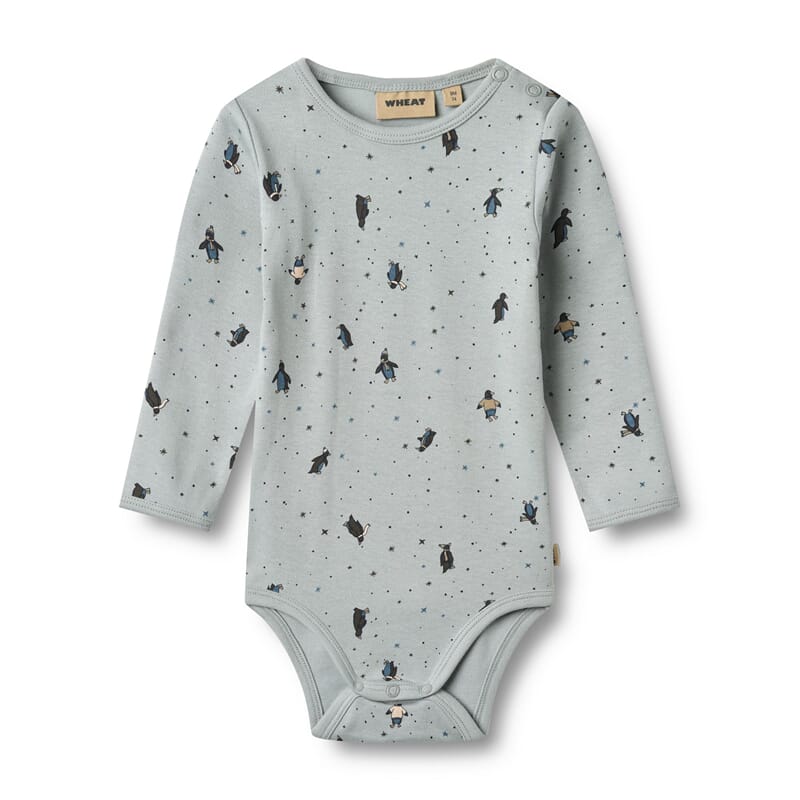 Nydelig body fra Wheat i fin blåfarge med lekkert print av pingviner. Mykt og behagelig bomullskvalitet. Trykknapper mellom beina og på skulder.