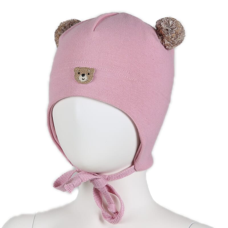Vårlue fra Kivat med god passform for de minste. Snøring under haken. Vindstopper ved ørene. Lekker rosa med søt teddybjørn-applikasjon. Melerte beige/brune dusker.