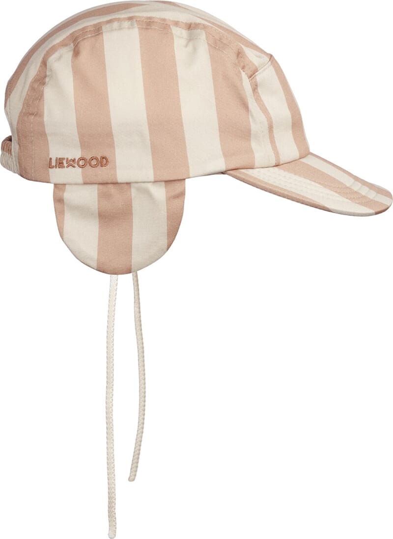 Babycaps i behagelig bomullsmateriale med delikate striper. Bred brem og beskyttelse på ører. Strikk bak og knyting under haken.