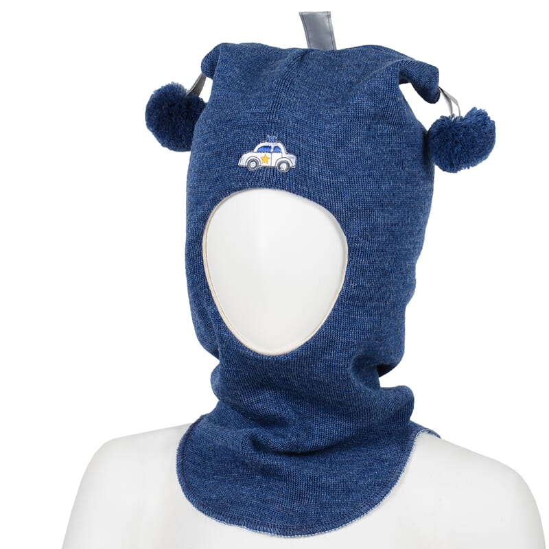 Blå lue med en liten politibil i pannen. Klassisk luefasong fra Kivat med god passform.