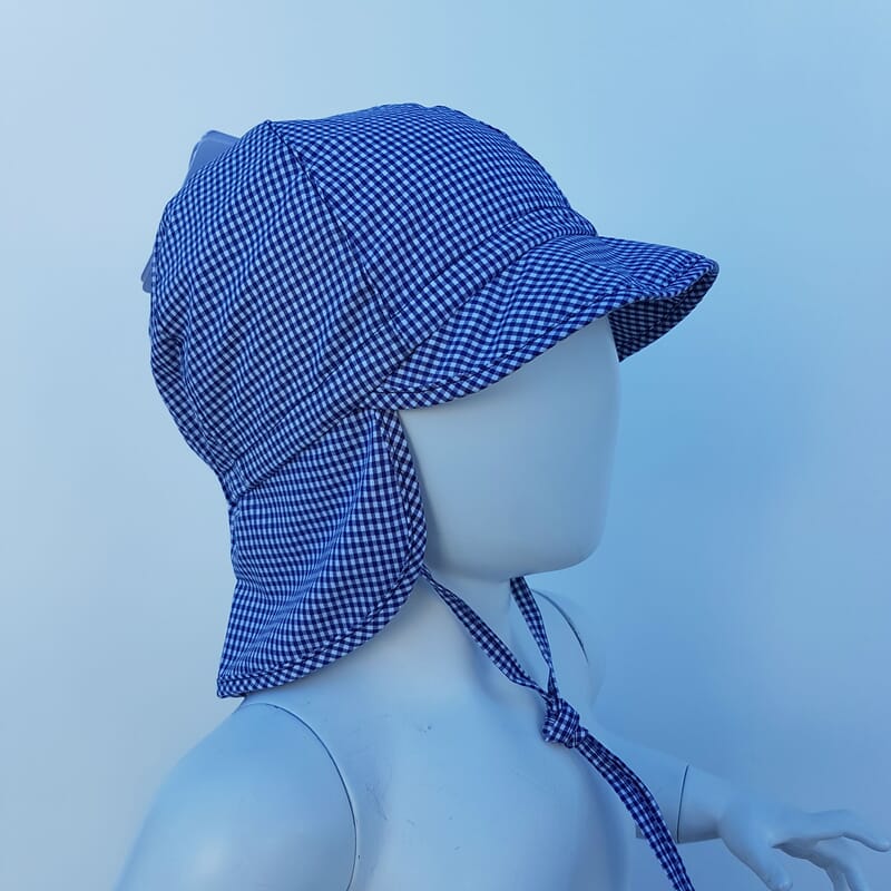 Lekker tynn og lett solhatt i mørkeblå og hvite ruter. God passform. Nakkebeskyttelse og knyting under haken. Brem fremme. UV 15+. Perfekt til dager med sol!