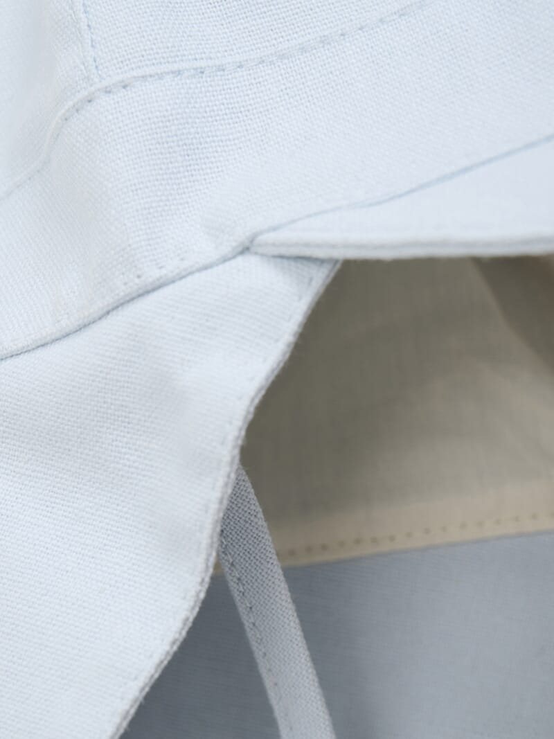 Solhatt for de minste i deilig svalende lin- og bomullsblanding. God beskyttelse mot solen med bred brem i front og god dekning på sidene og i nakken. Lekker blåfarge.