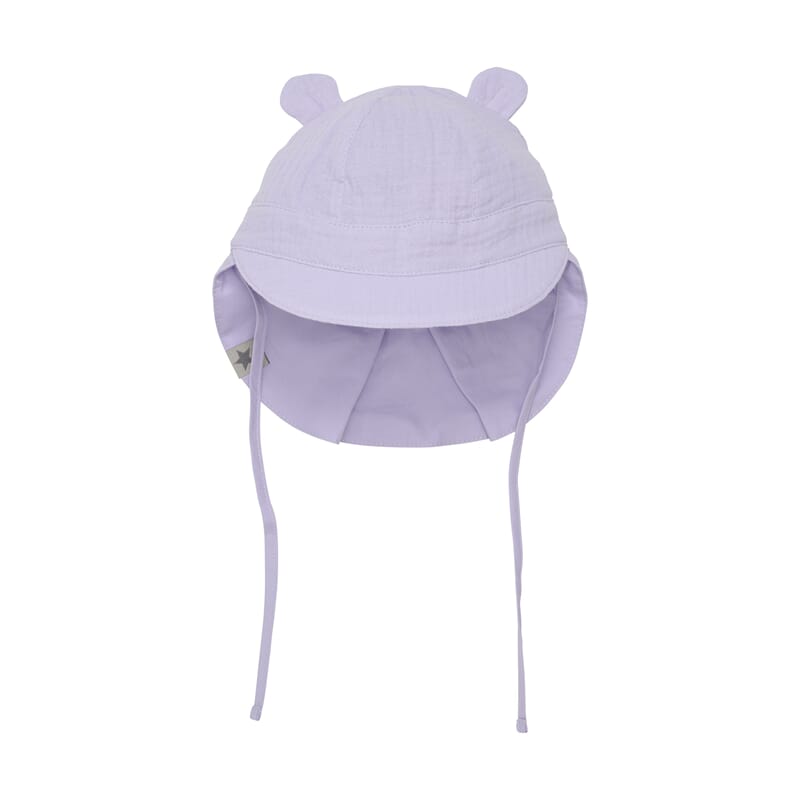 Solhatt for de minste i deilig svalende musselin stoff. God beskyttelse mot solen med bred brem i front og god dekning på sidene og i nakken. Lekker lillafarge som matcher mange av sesonges plagg.