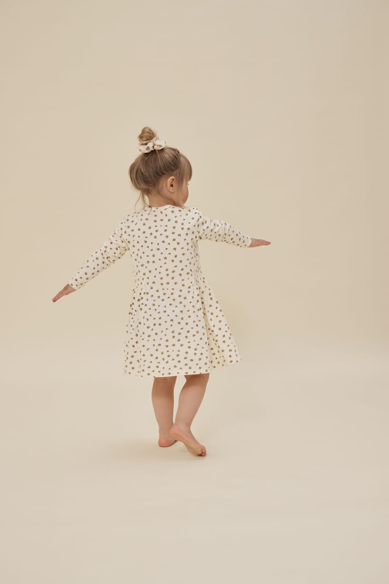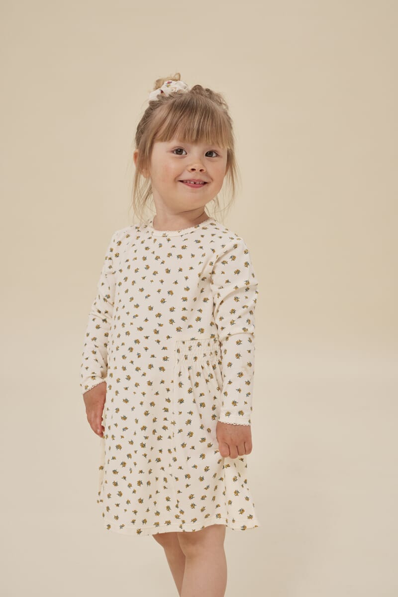 Kjole i mykt og behagelig bomullsmateriale. Noe vidt skjørt og med strikk i livet. Søtt print med blomster.