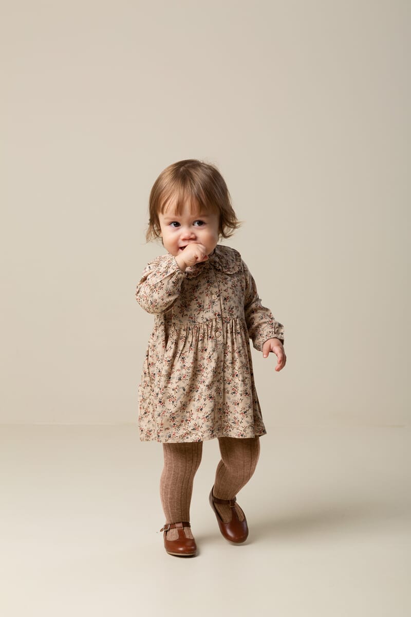 Deilig materiale og søte detaljer. Blomsterprint på beige bakgrunn. NB! Noe liten i størrelsen. Vi anbefaler å gå opp 1 størrelse.
