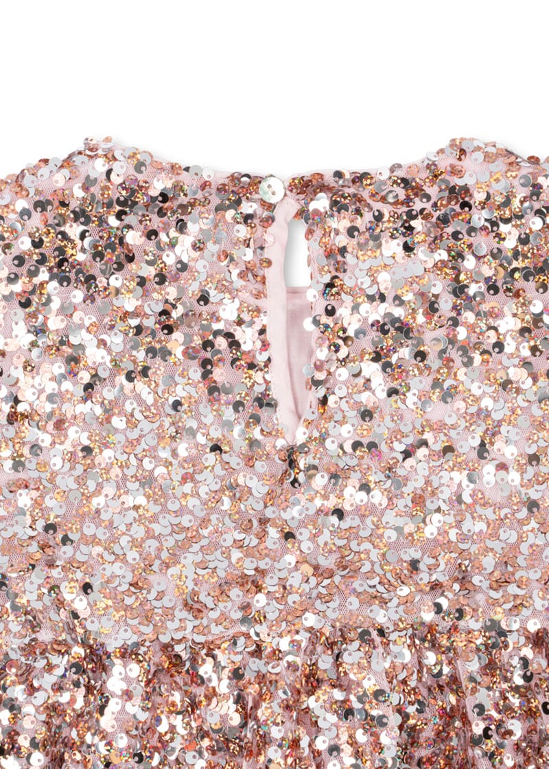Lekker kjole med rosa og glitrende paljetter. Fine detaljer og rysjer i skjørtet.