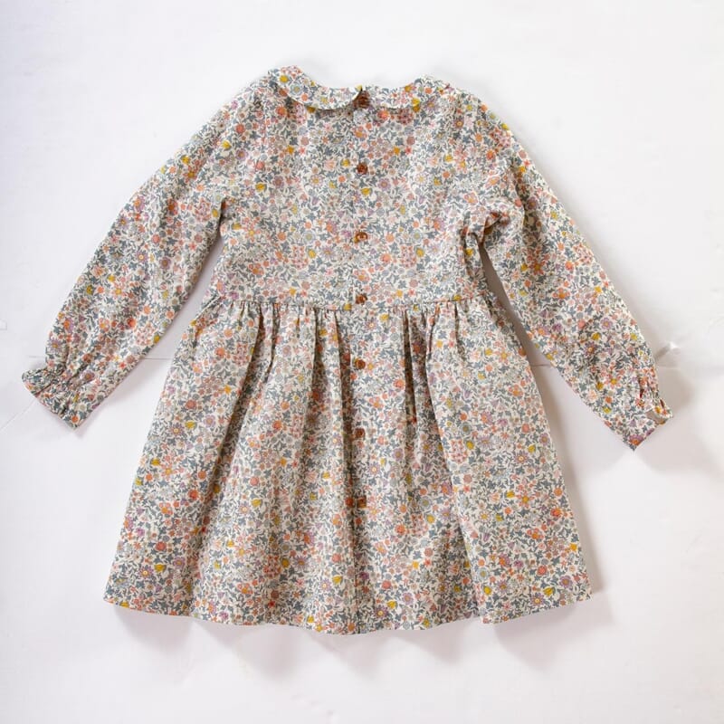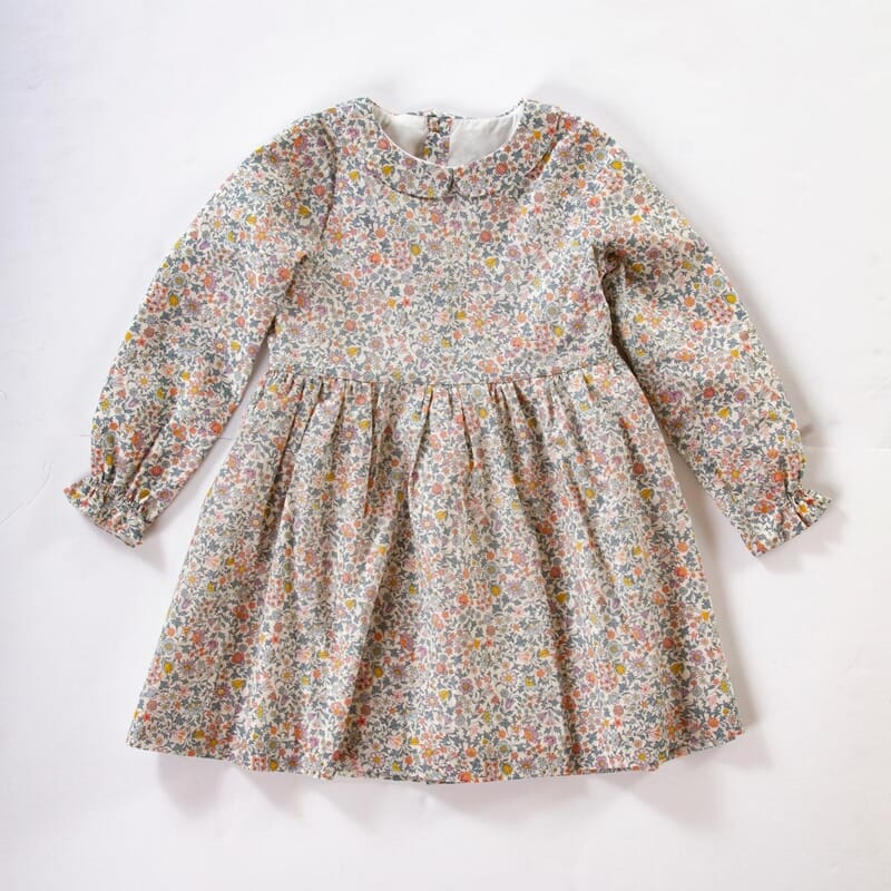 Langermet kjole i eksklusiv liberty bomull i fantastisk blomsterprint. Lekker passform. Fin enkel Peter Pan-krage og søte rysjeermer. Knapping i ryggen. Normal i størrelsen, men vipp opp om du ligger mellom størrelser.