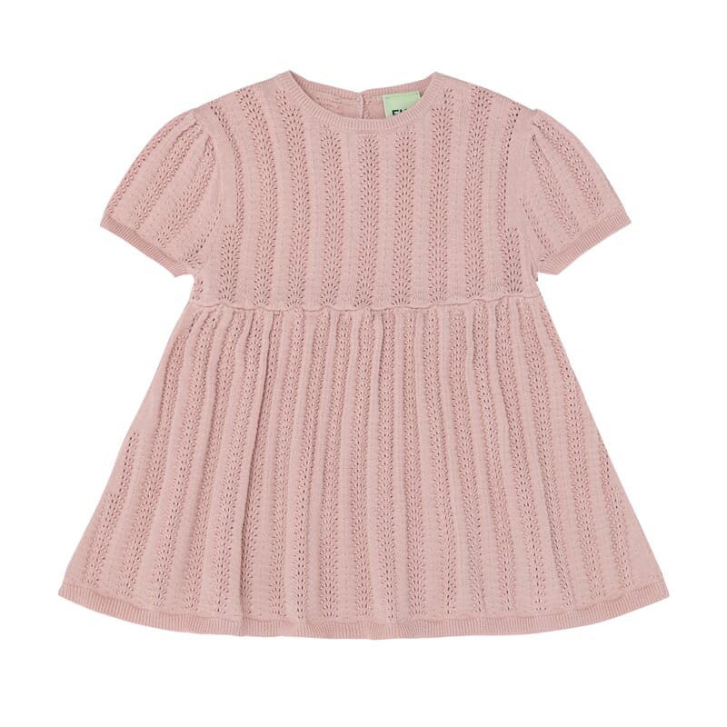 Nydelig rosa kjole top med lekkert pointelle mønster i strikken. Deilig myk bomullskvalitet. Fine folder som gir volum til skjørtet. Perlemorsknapping i ryggen.