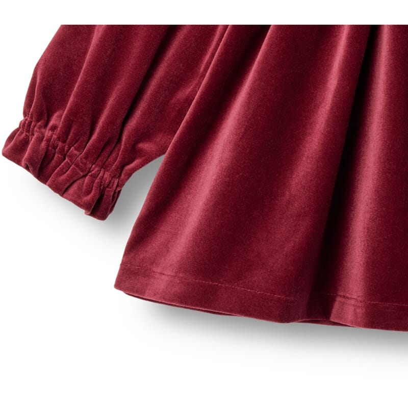 Kjole i lekker velourkvalitet. Nydelig dyp rødfarge. Flatterende, løs og behagelig passform. Knapping i ryggen. Matcher Thelma for de større størrelsene som søskenmatch.