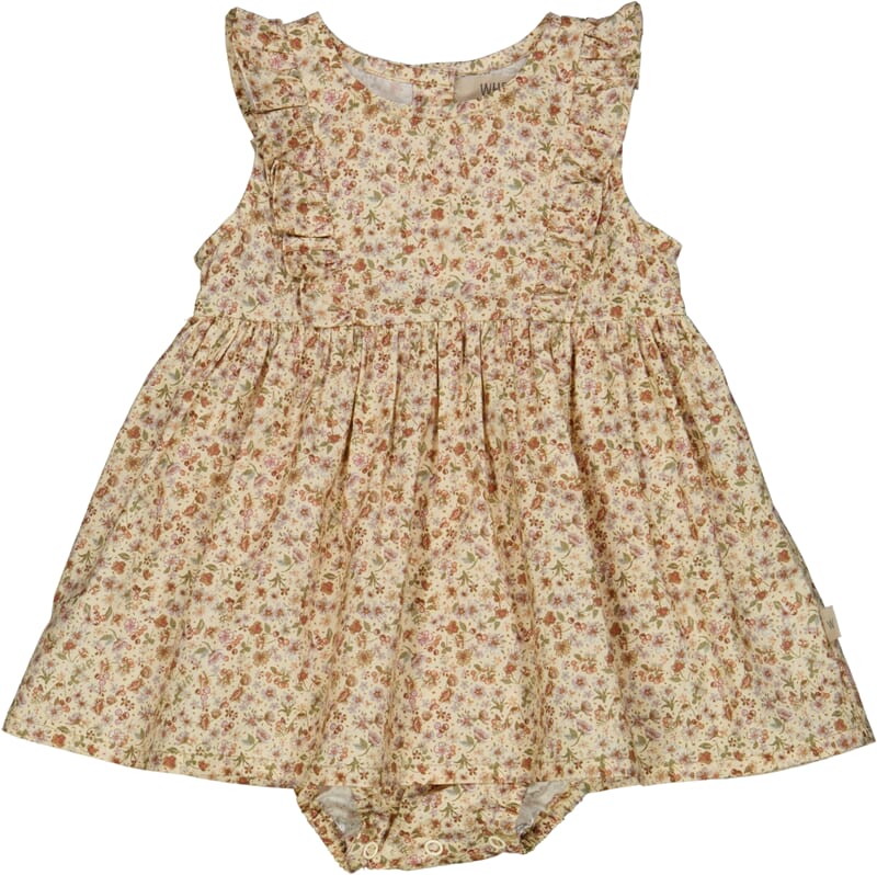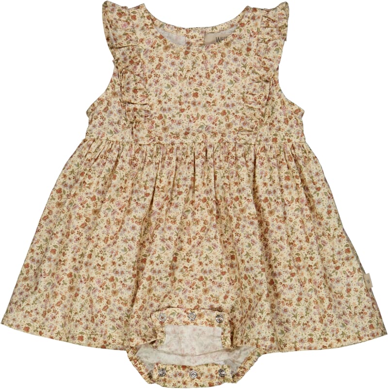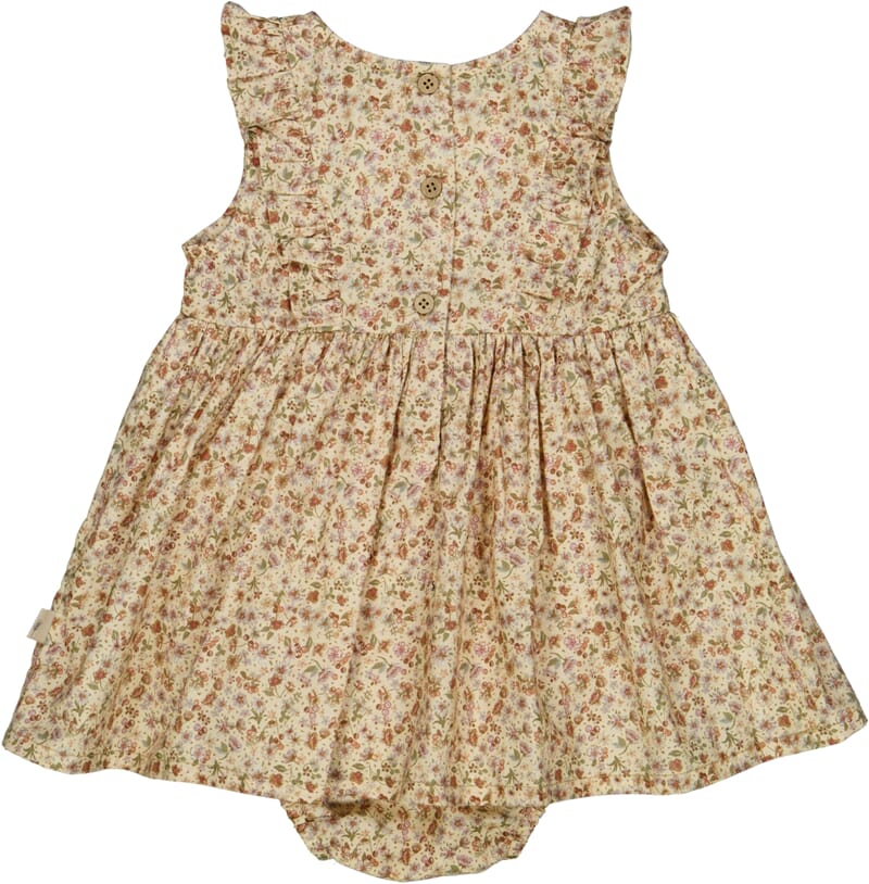 Lekker ermeløs kjole med rysjer i front. Praktisk body under. Nydelig blomsterprint. Knapping bak og i skrittet.