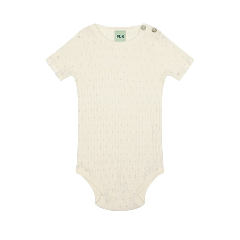 Kortermet kremfarget body med.lekker pointelle struktur. Blondedetaljer langs kragen. Perlemorsknapper på skulderen og knapping mellom beina. Deilig myk bomullskvalitet
