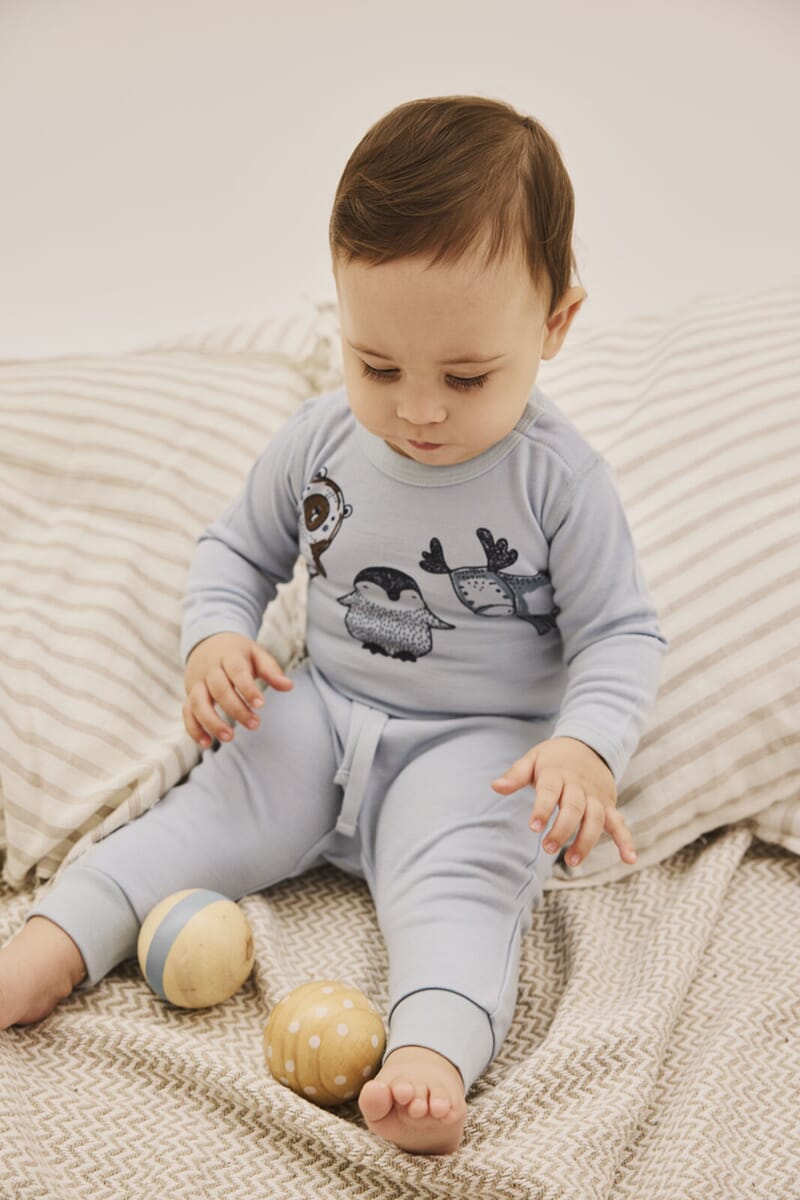 Ull utenpå, bambusviskose mot huden. Myk og behagelig kvalitet. God passform. Fint dyreprint.