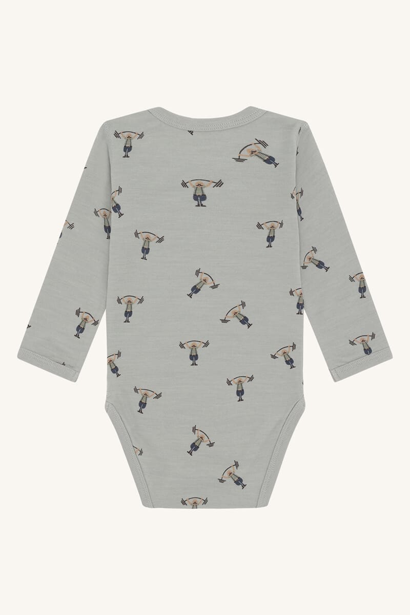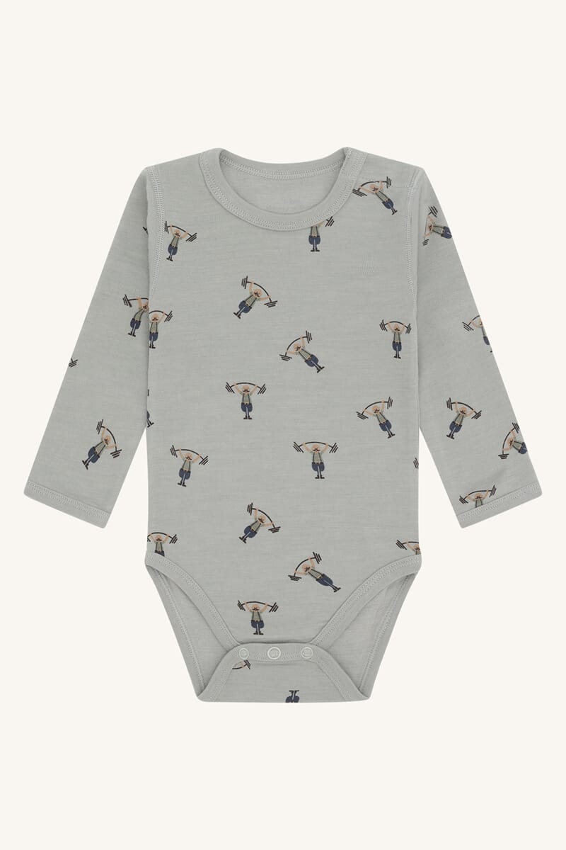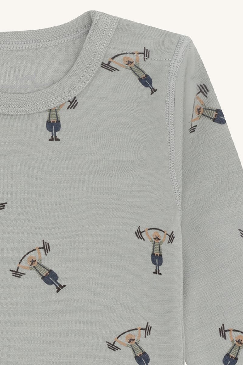 Ull utenpå, bambusviskose mot huden. Myk og behagelig kvalitet. God passform. Morsomt print av "sterk mann".