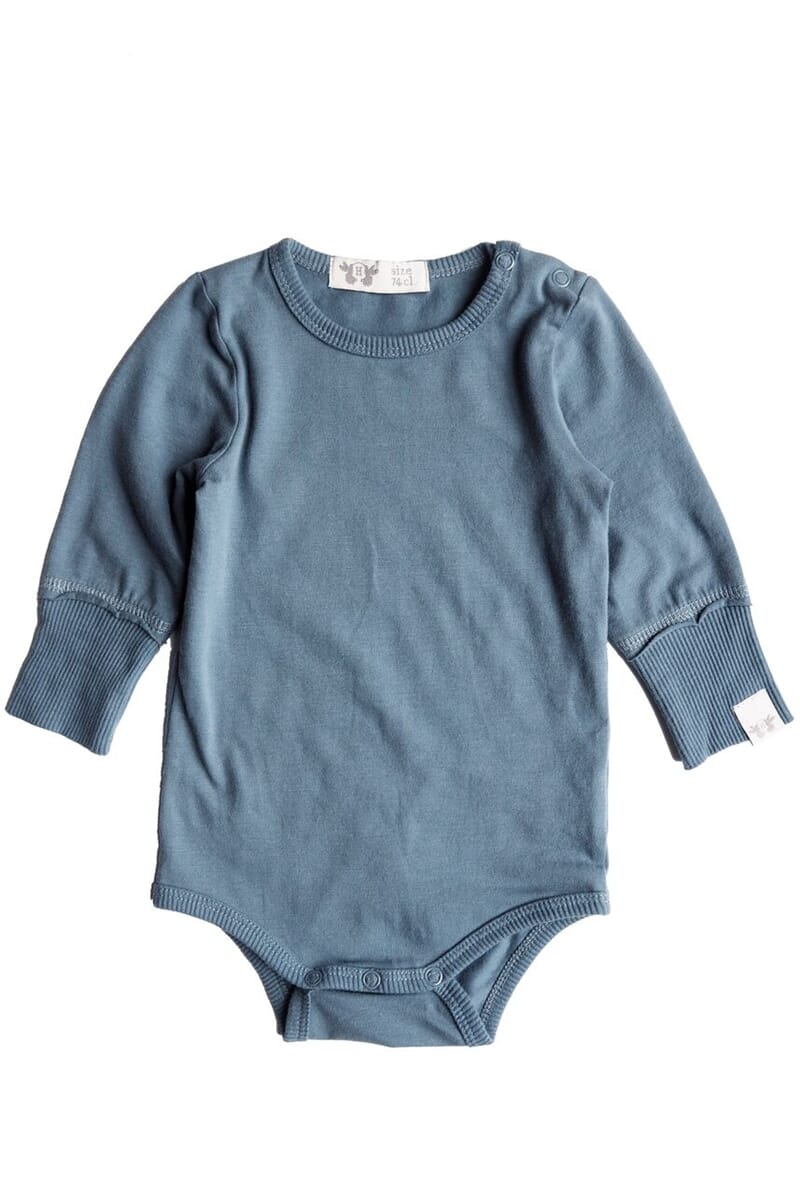 Body i myk bomull. Lekker sjøblå-farge. Ribbet kant rundt ermene. Knapper ved skulderen.