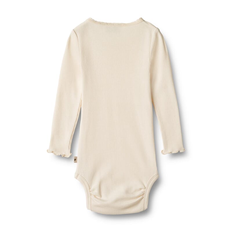 Ribbet body i myk og behagelig kvalitet. Lekker blondekant rundt halsen. Trykknapper mellom beina og på skulder for enkel av- og påkledning.