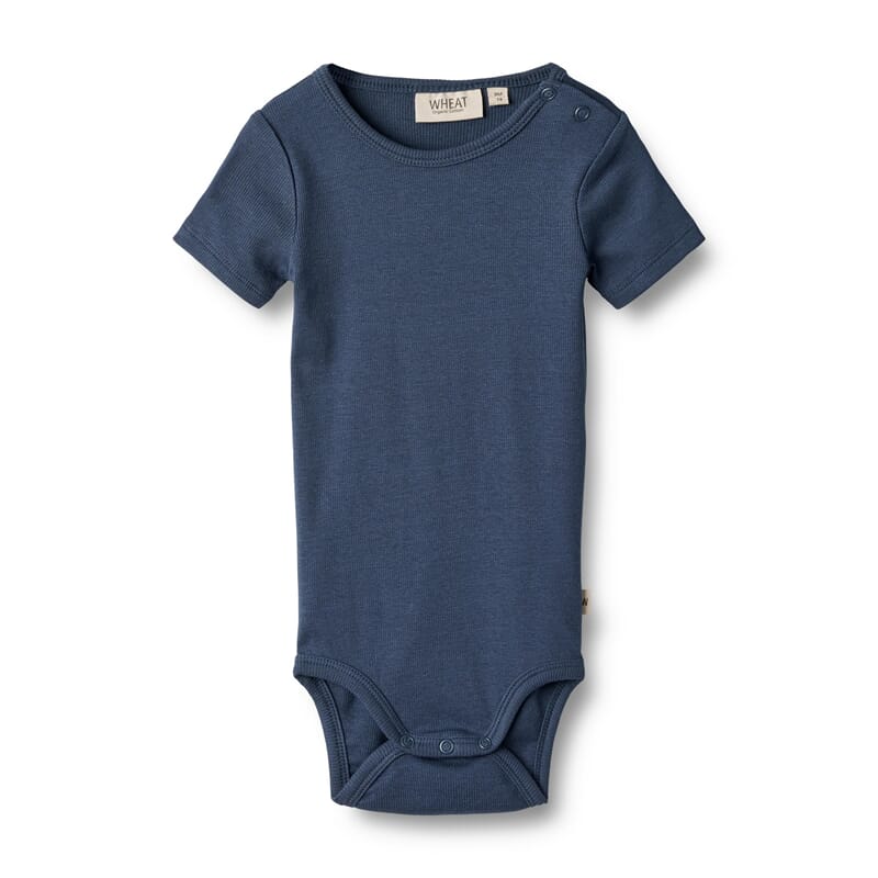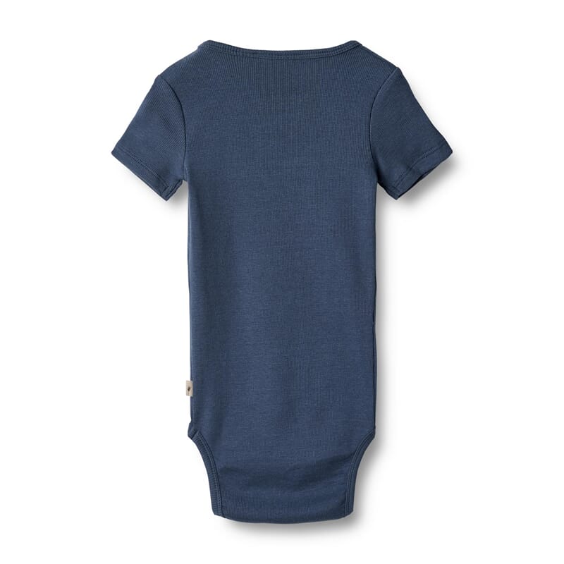 Mørkeblå kortermet body i behagelig og mykt bomullskvalitet. Ribbet kvalitet og god stretch. Trykknapper mellom bena og på skulder.