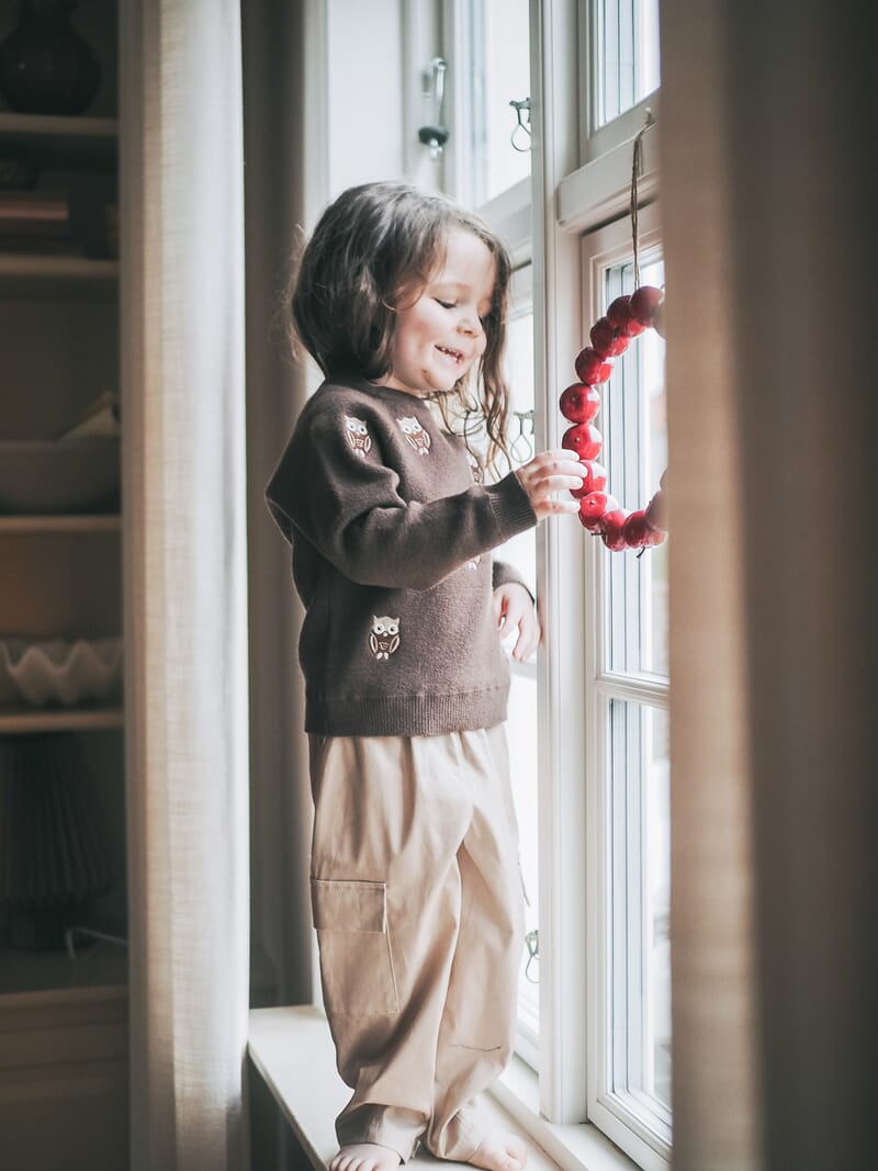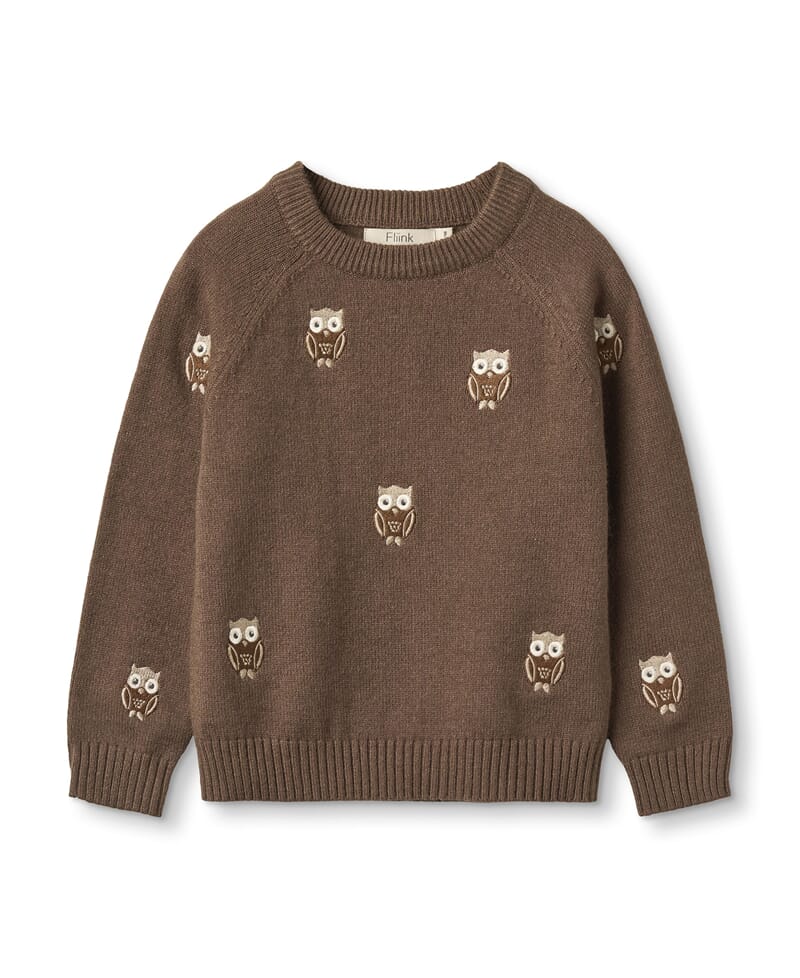 Klassiker fra Fliink. Genser i deilig myk strikk i viscose-kvalitet. Lekker mørkebrun med søtt print av ugler.