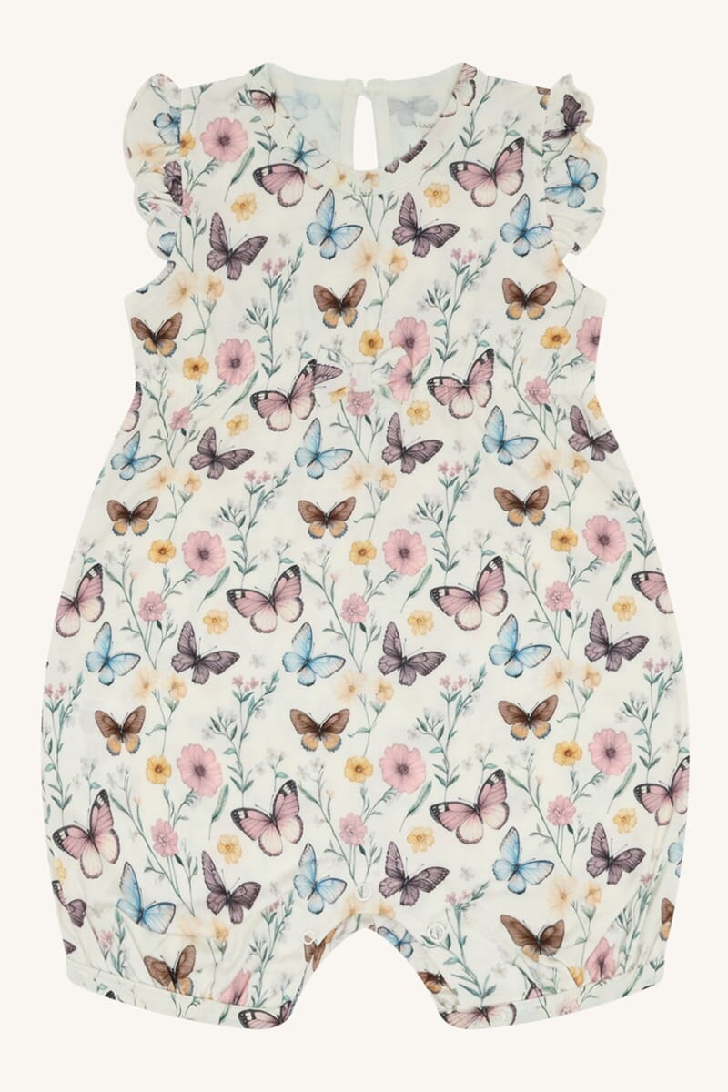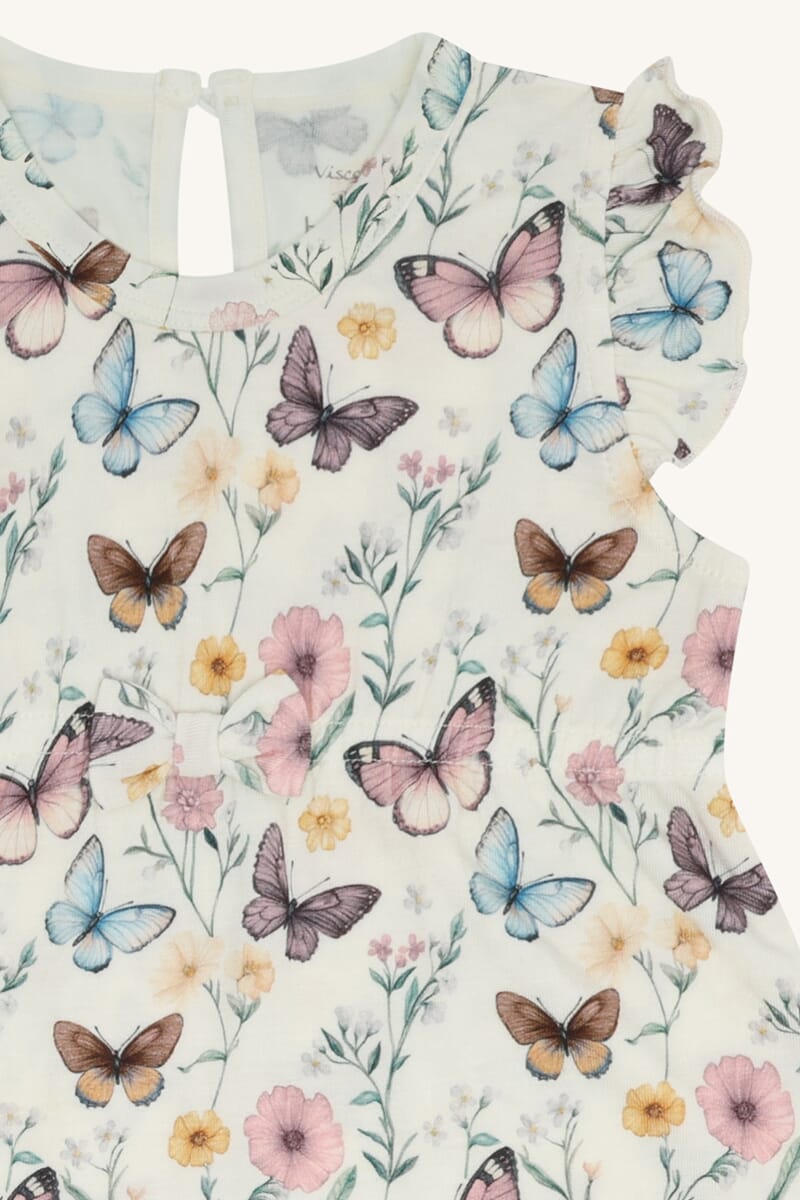 Sommerdrakt i deilig svalende bambuskvalitet. Nyelig print av sommerfugler i delikate farger. Rysjer over ermene. Knapping i ryggen.