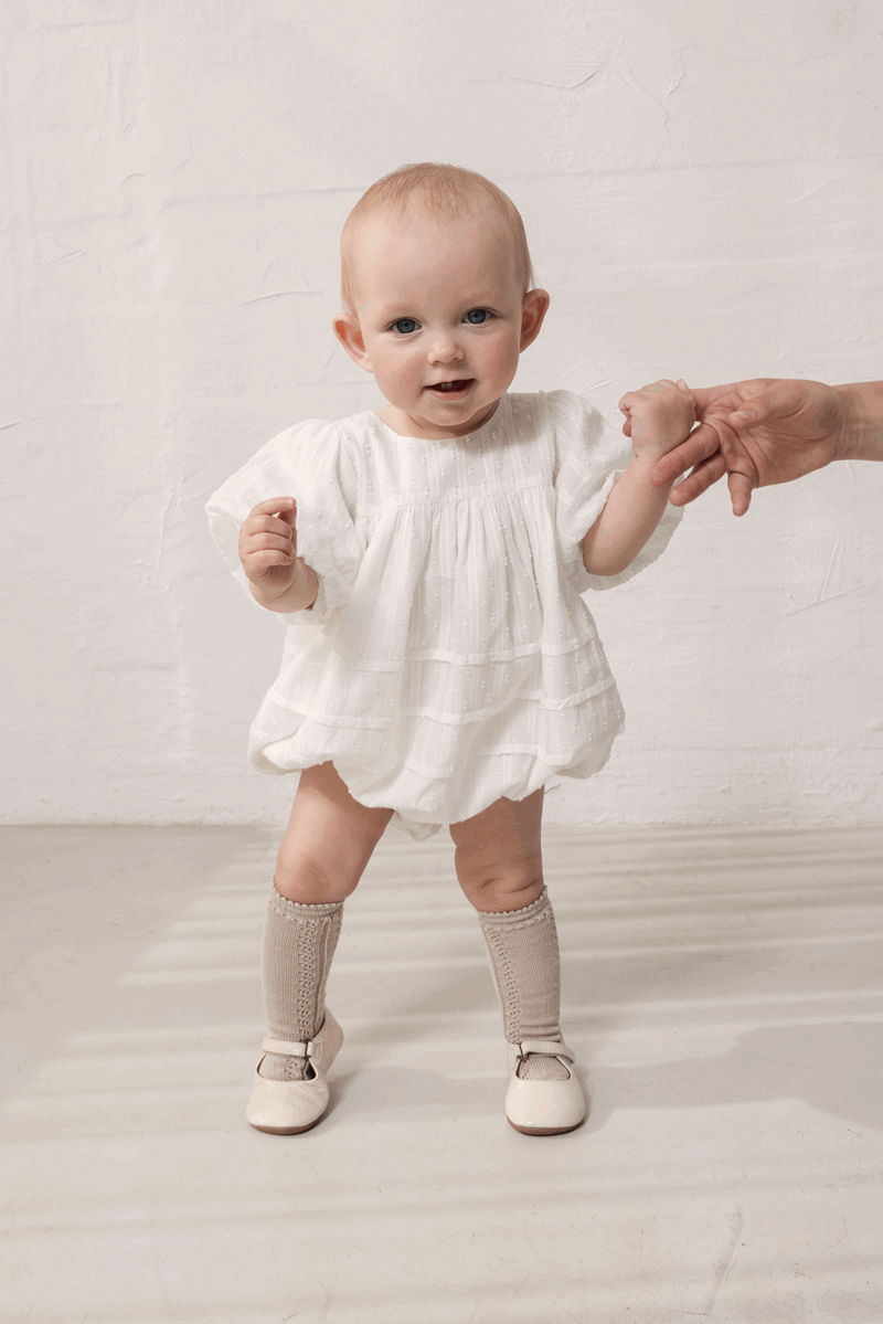 Kortermet romper fra MarMar Copenhagen i god bomullskvalitet med ekstra mykt bomullsfôr. Lekre dekorative detaljer i stoffet. Søte puffermer. Løs og behaglig fasong.