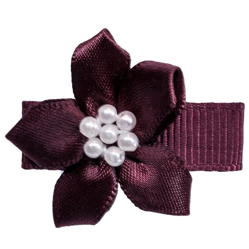 Liten hårspenne med søt blomst i sateng med perler i midten. Ca 3 cm lang. Festet på babyspenne med antiskli som krever kun få hårstrå for å sitte fast. Fin til baby og små jenter.