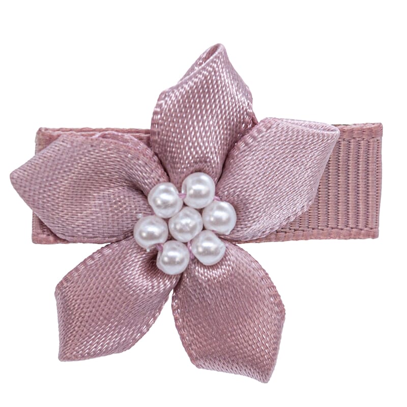 Liten hårspenne med søt blomst i sateng med perler i midten. Festet på hårspenne med antiskli. Fin til baby og små jenter.