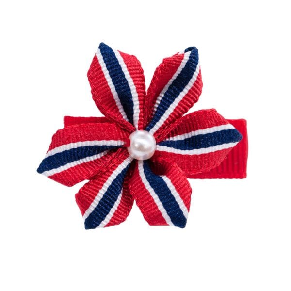 Nydelig sløyfespenne med antiskli. Lekker blomsterform med perle i midten. Sløyfen måler ca 4 cm.