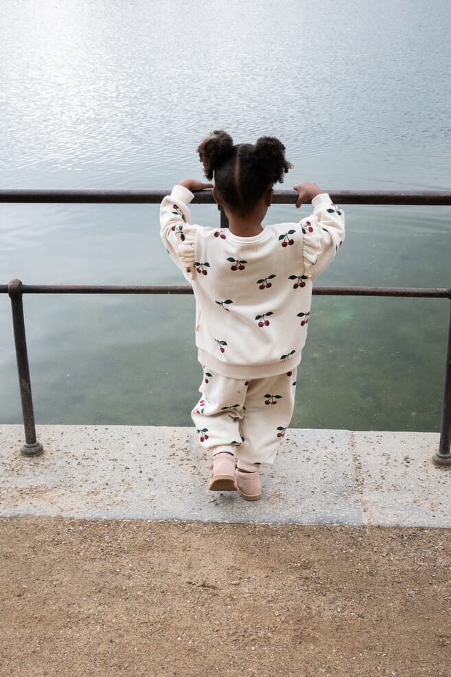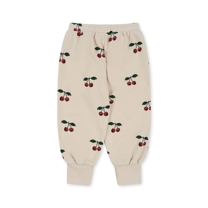 Joggebukse lekkert print av kirsebær. Behagelig og mykt bomullsmateriale. Snøring i livet, sidelommer og strikk i beina. Fint sett sammen med Lou frill sweat shirt.