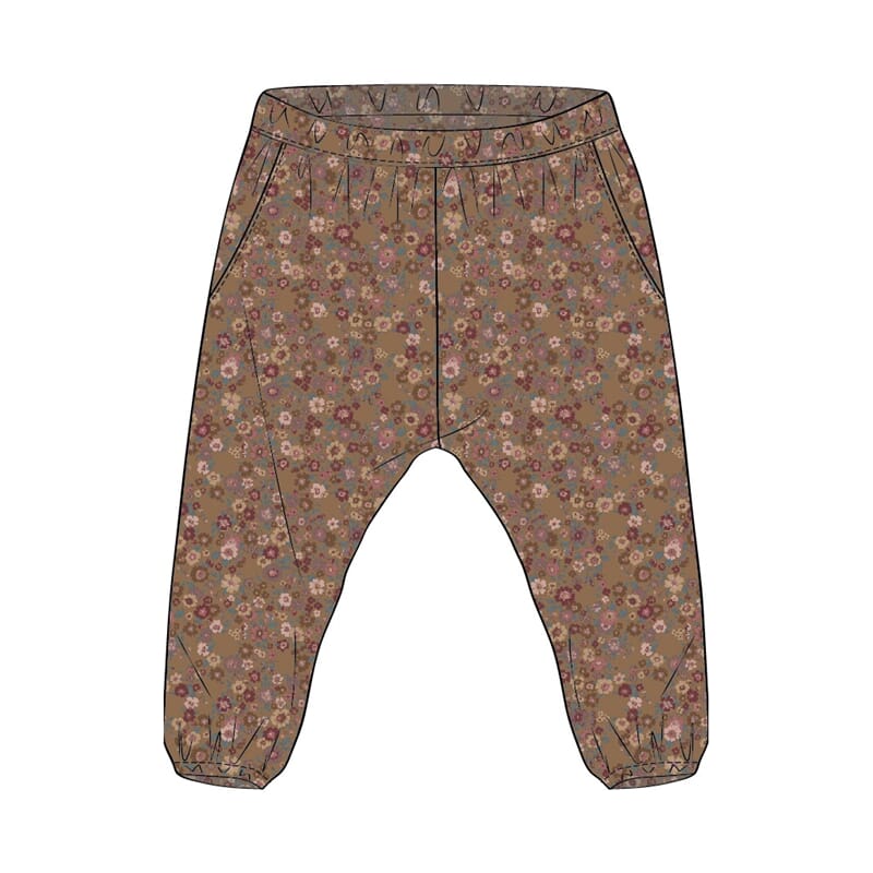 Bukse i myk cordstoff med blomstermotiv. Lekker karamellbrun bakgrunn med blomster i rosa og lilla. Strikk i livet og beina. Myk kvalitet og god passform.