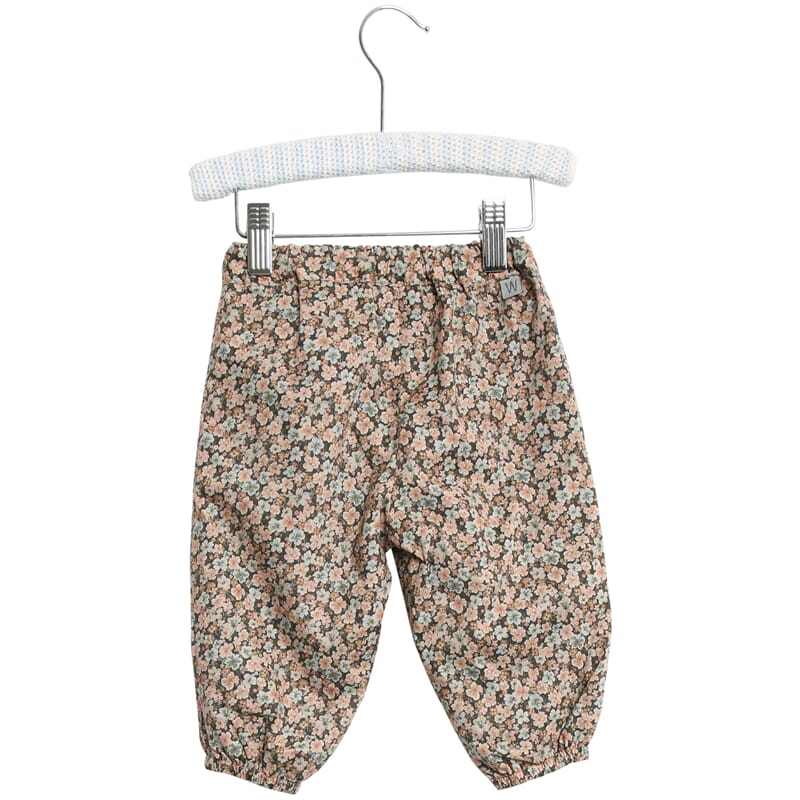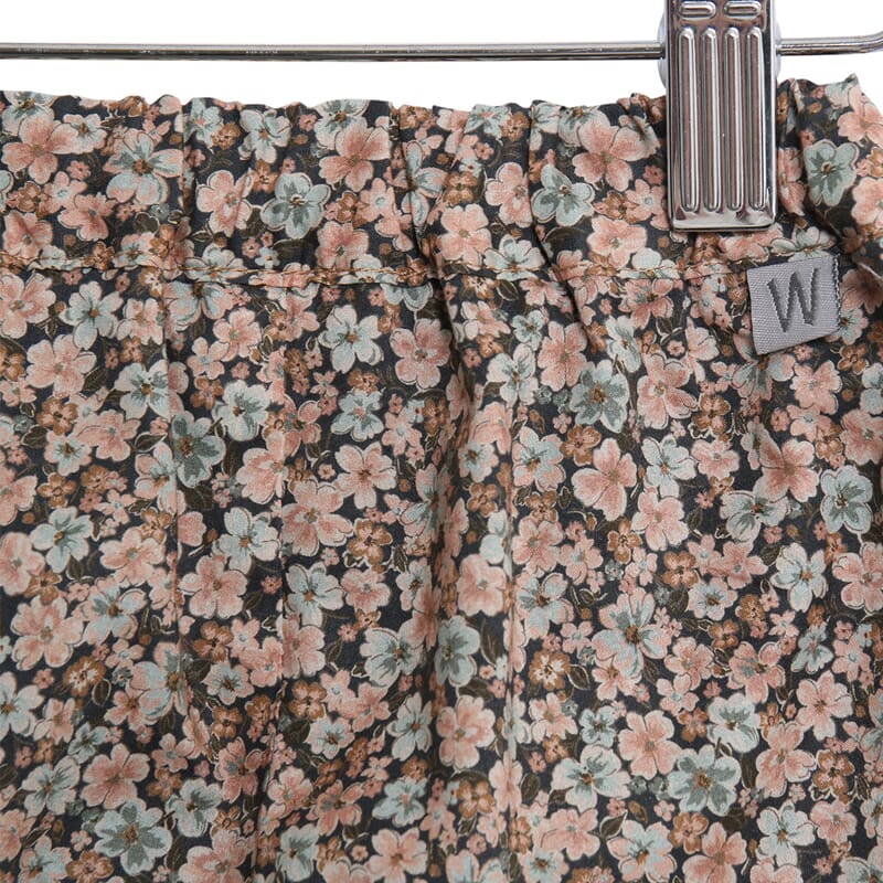 Bomullsbukse med lekkert blomstermønster i rosa, lyseblå og karamell på mørkeblå bakgrunnsfarge. Myk kvalitet og behagelig, løs passform.