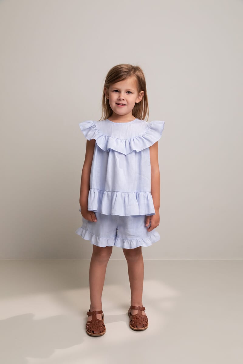 Nydelig skjorts med rysjer fra MarMar Copenhagen. Strikk i livet. God og behagelig linkvalitet. Nydelig farge.