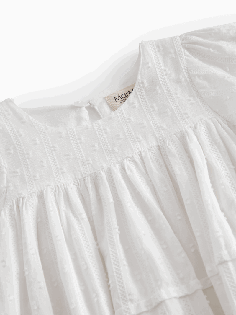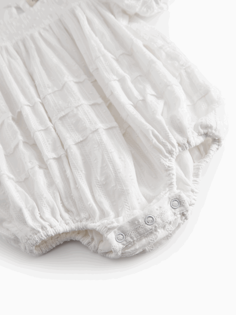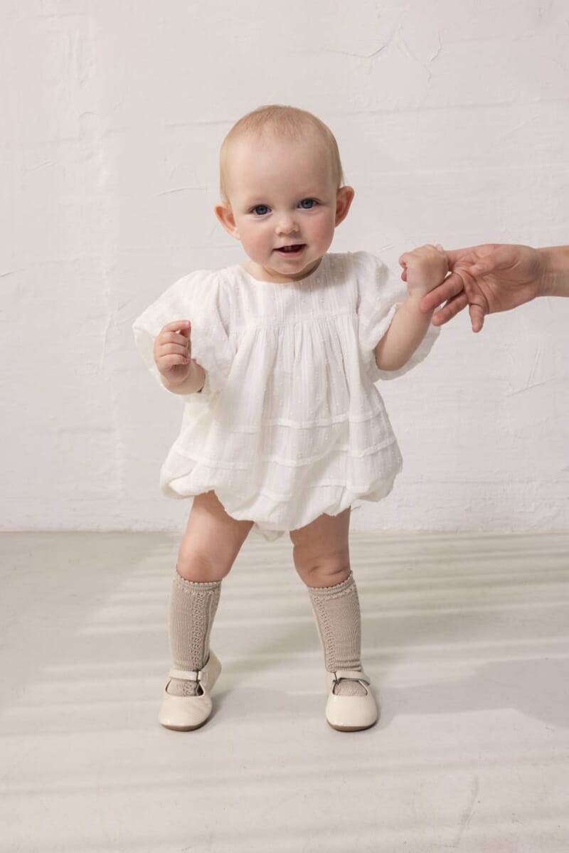 Kortermet romper fra MarMar Copenhagen i god bomullskvalitet med ekstra mykt bomullsfôr. Lekre dekorative detaljer i stoffet. Søte puffermer. Løs og behaglig fasong.