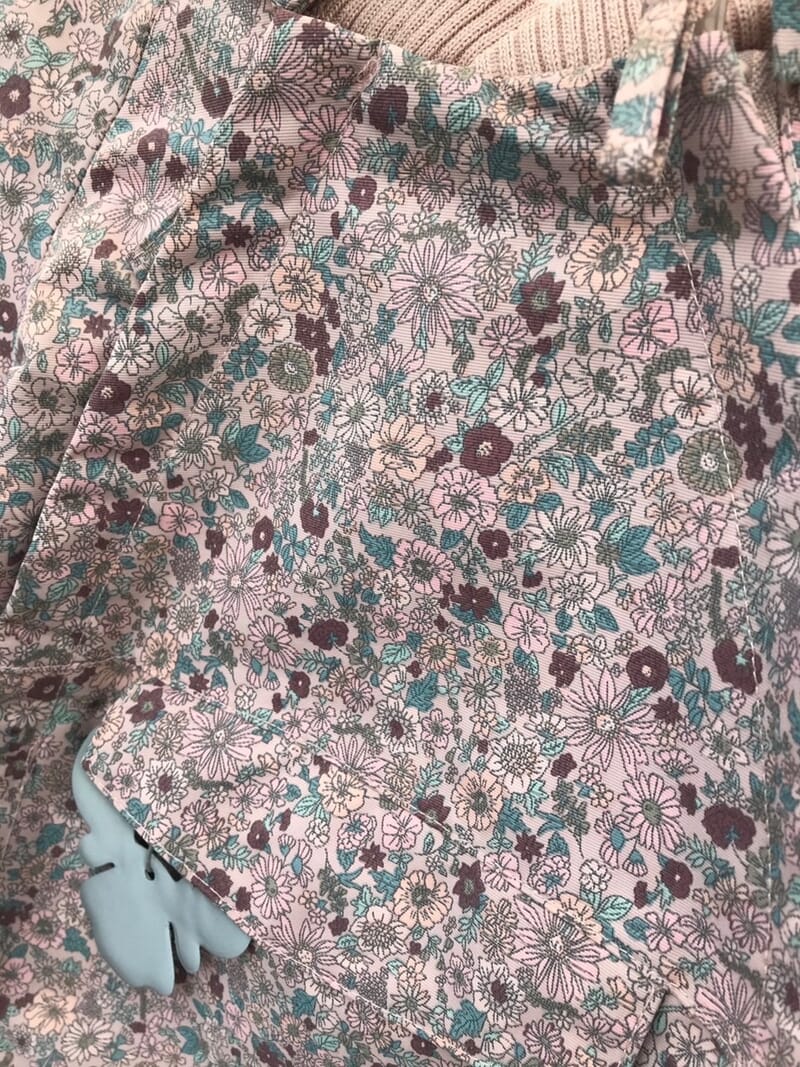 Tapede sømmer, 10.000 mm vannsøyle, pusteevne 8000 g/m2/24h. Strikk i midjen og ved anklene. Duse farger med mønster av blomster.