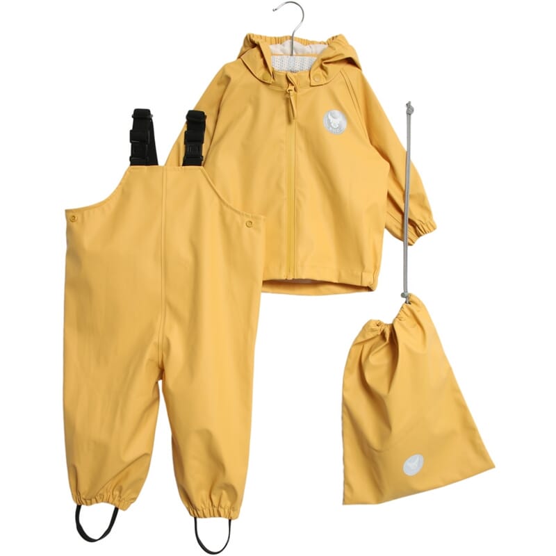 Svært mykt og behagelig regntøy. Bukse med seler. Avtagbar hette med trykk-knapper. Glidelås i front. Tapede sømmer. 8.000 mm vannsøyle. Lekker ny gulfarge.