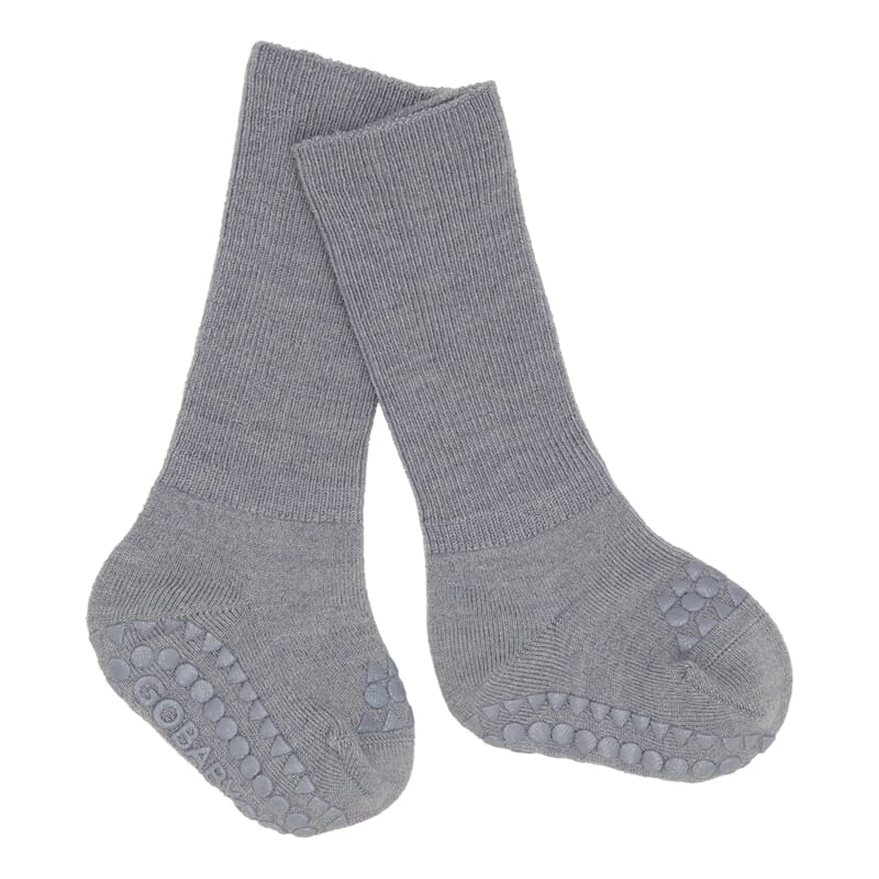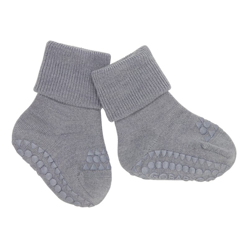 Gode sokker i myk ullkvalitet med antiskli på under- og oversiden. Høye i skaftet, sitter godt på og kan brettes ned. Perfekt til når barnet begynner å krabbe og gå.