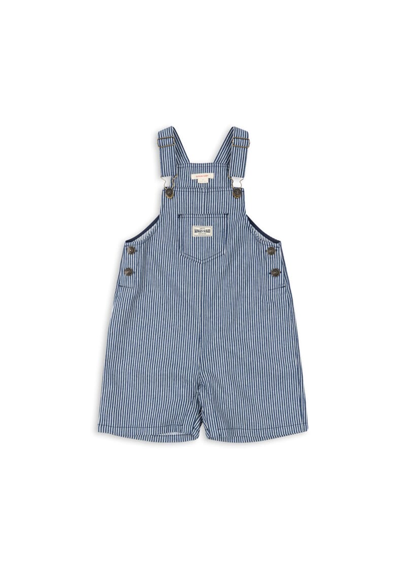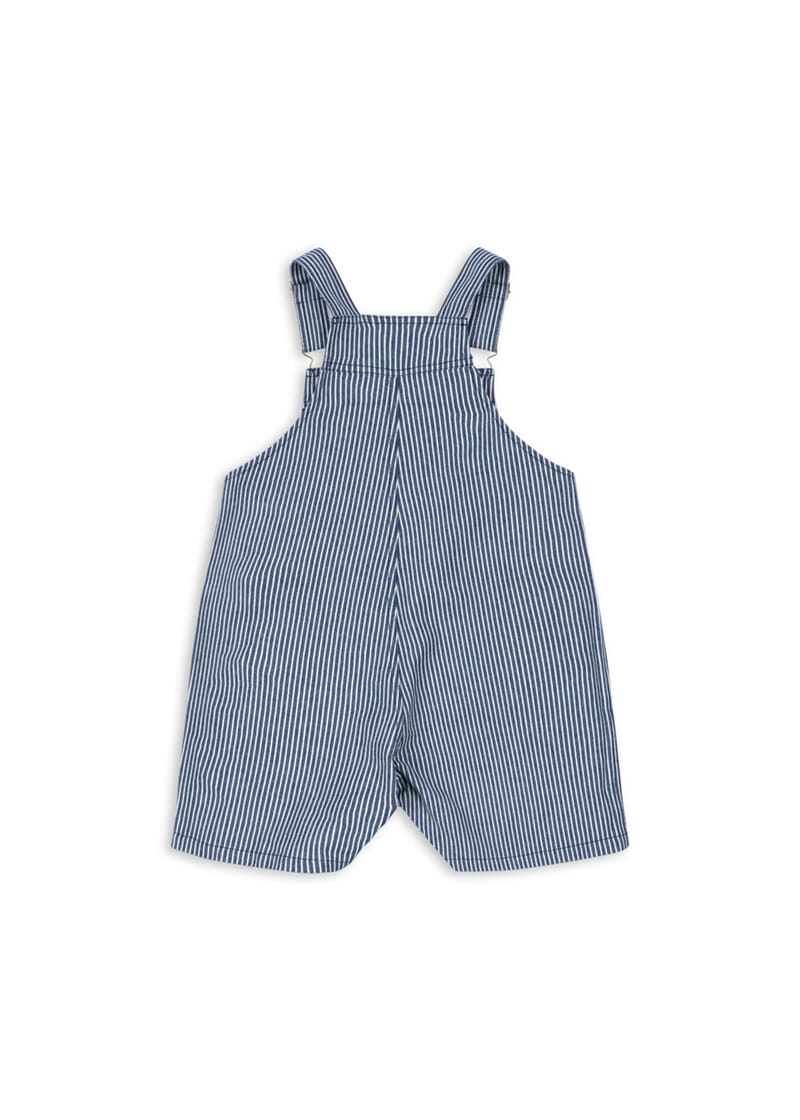 Blåstripete overall med korte ben i behaglig myk dongeri. Lukking med stropper og knapping i siden.