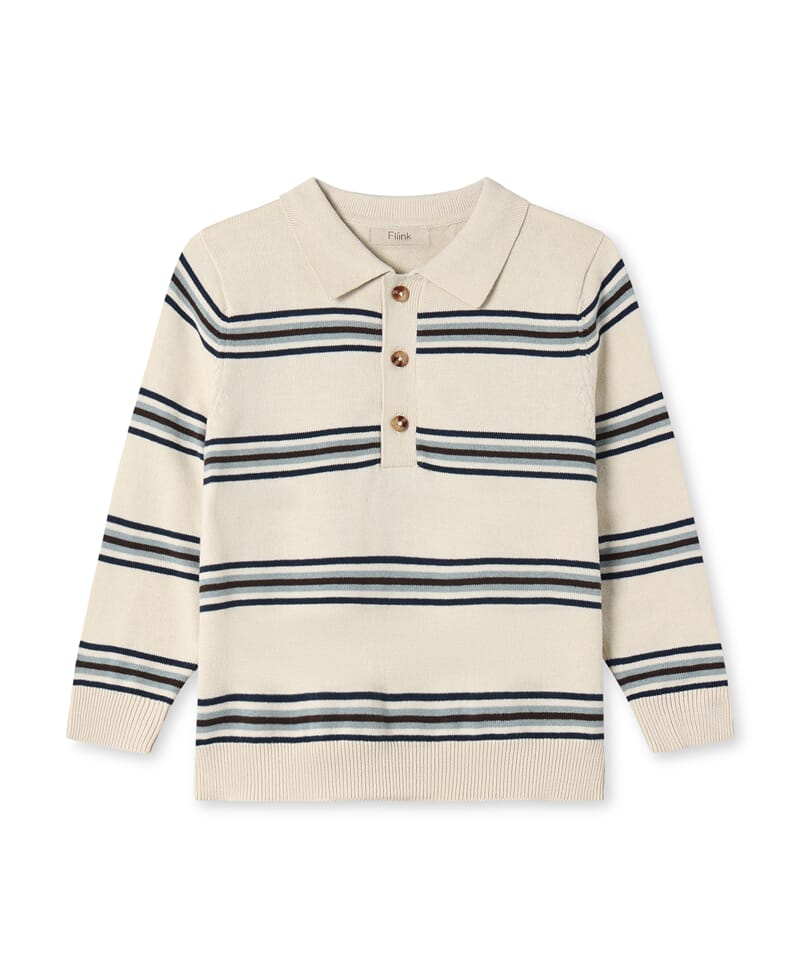 Lekker genser med skjortekrage og dekorative knapper i front. God myk bomullskvalitet. Lekker kremfarget med blå og brune striper.