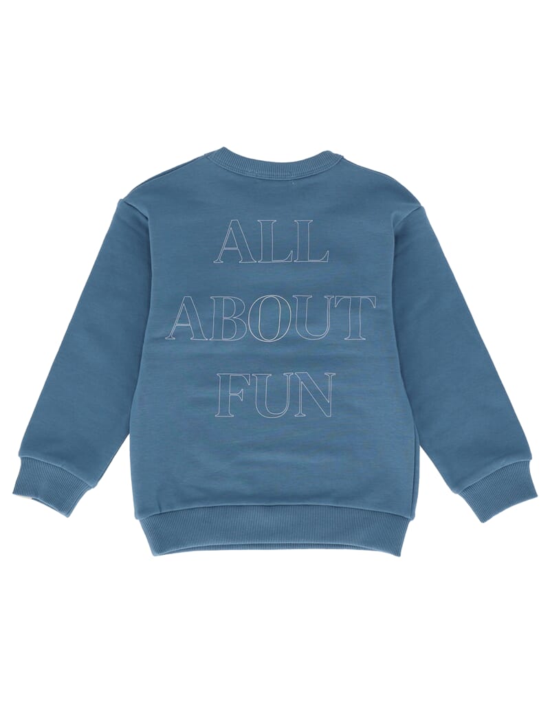 Myk og behagelig collegegenser i nydelig blåfarge. God stretch og gøy print av "All about fun" på ryggen. Lett frotté på innsiden.