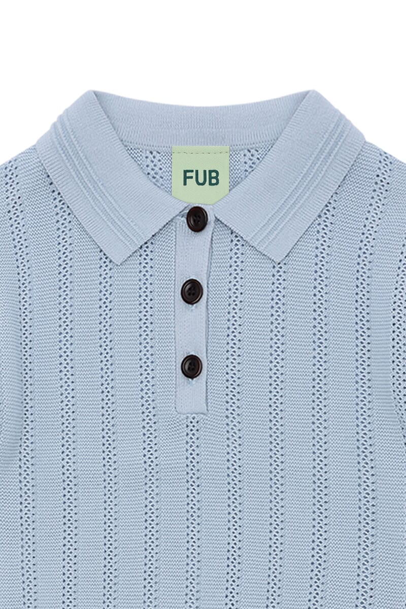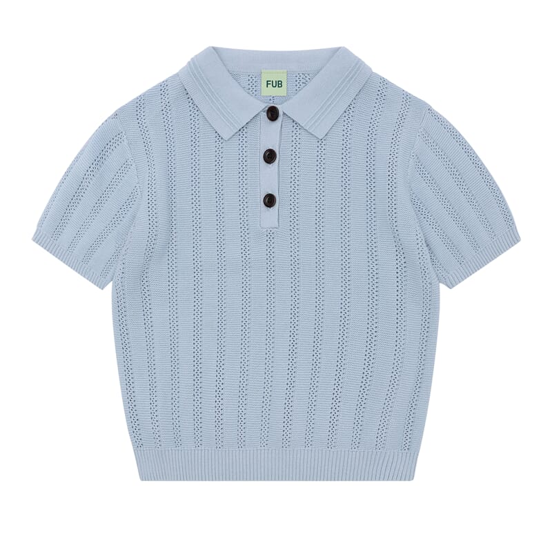 Fin lyseblå t-skjorte med lekker pointelle struktur. Klassisk skjortekrage med dekorative detaljer. Fin passform, dekorative knapper, ribbestrikkede kanter. Myk og behagelig bomullskvalitet.