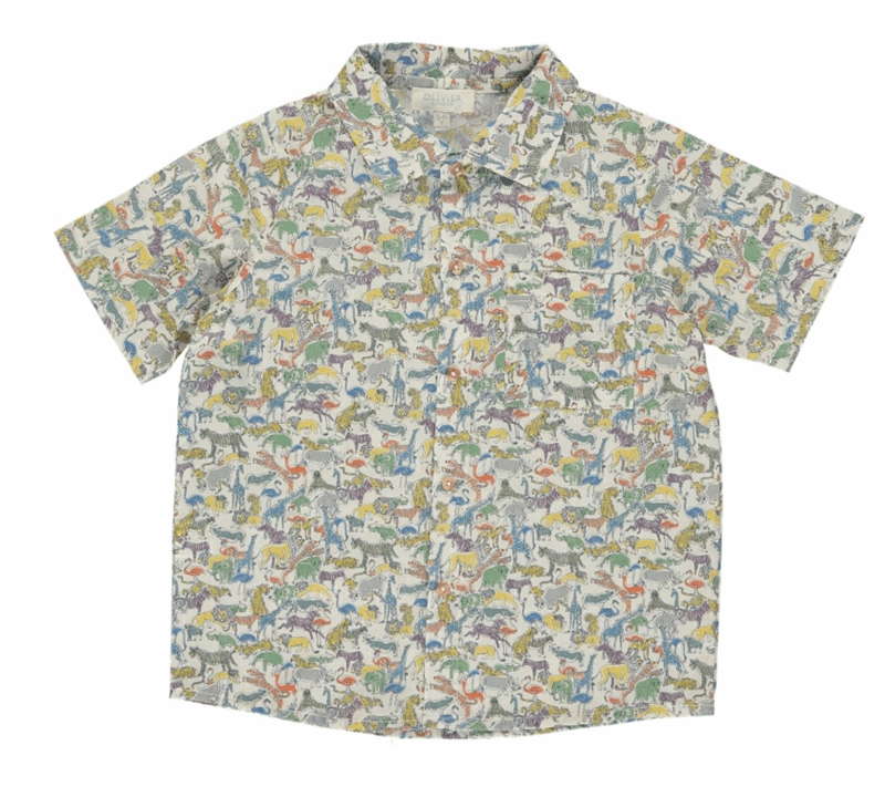 Stilig sommer-skjorte fra Olivier med korte ermer i lekker liberty-kvalitet. Fargerikt print av dyr fra Afrika. NB! Noe små i størrelsen, vi anbefaler å vippe opp en størrelse.