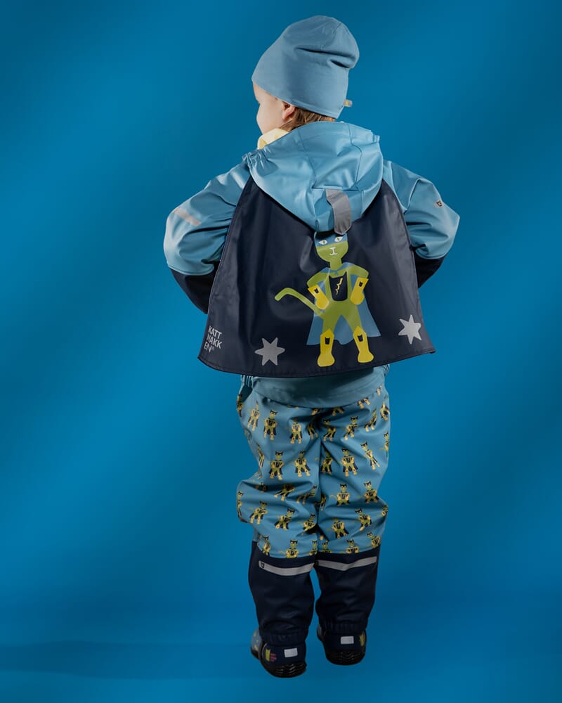 Plask regnsett fra Kattnakken sin Superkatten-kolleksjon med egen superheltkappe. Solid, ekstremt slitesterkt regntøysett med jakke og bukse med seler. Regntøyet har børstet innside som gjør det behagelig å ha på. Solide fotstrikker, reflekser på armer og ben, sveisede sømmer, anti-oppsugingsstoff på armer og bein og avtagbar og regulerbar hette. Vannsøyle på 30.000 mm. Regntøyet har blitt en favoritt hos både barn, foreldre og barnehager.