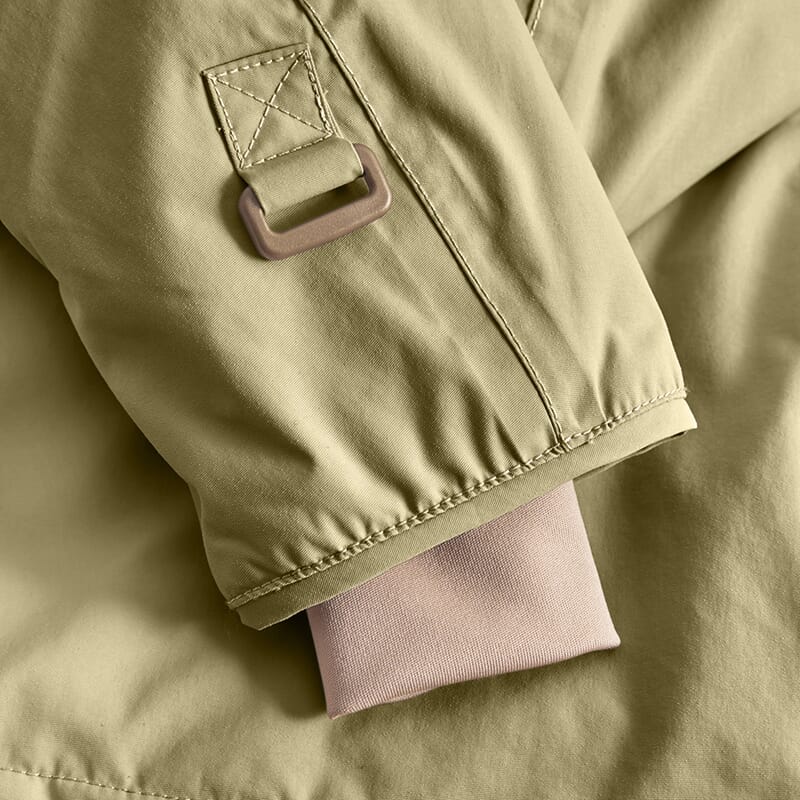 Delikat jakke med fine detaljer. Behagelig myk kvalitet. Fin grønnfarge. Vind og vanntett, vannsøyle 12.000 mm, pusteevne 8000, Tapede sømmer.