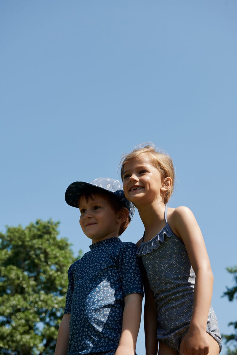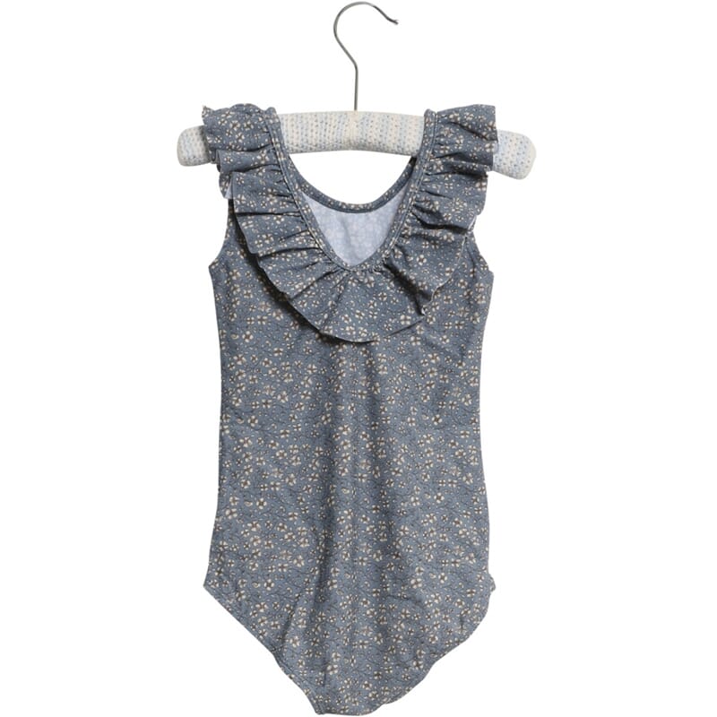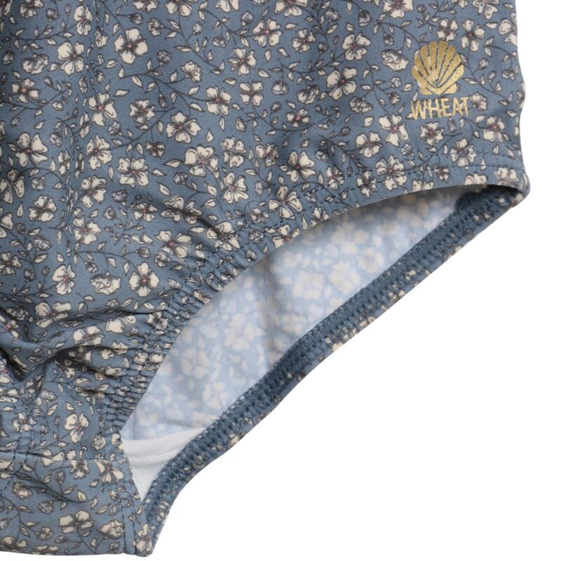Badedrakt med nydelig blomtserprint. Blågrå bakgrunn med lyse blomter. Rysjer i halslinning.