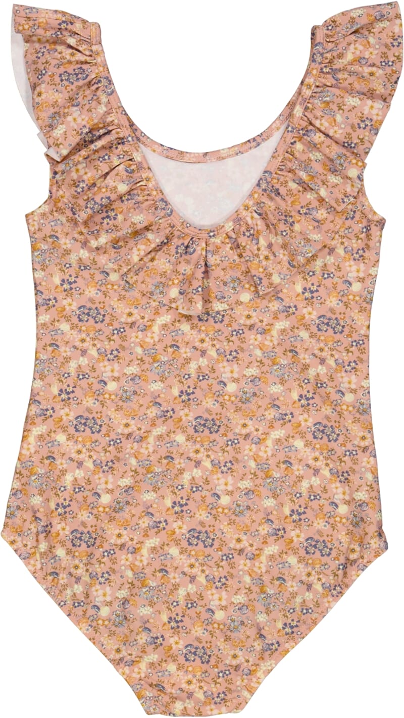 Badedrakt med nydelig blomtserprint. Nydelig print med blomtser og skjell. Rysjer i halslinning.