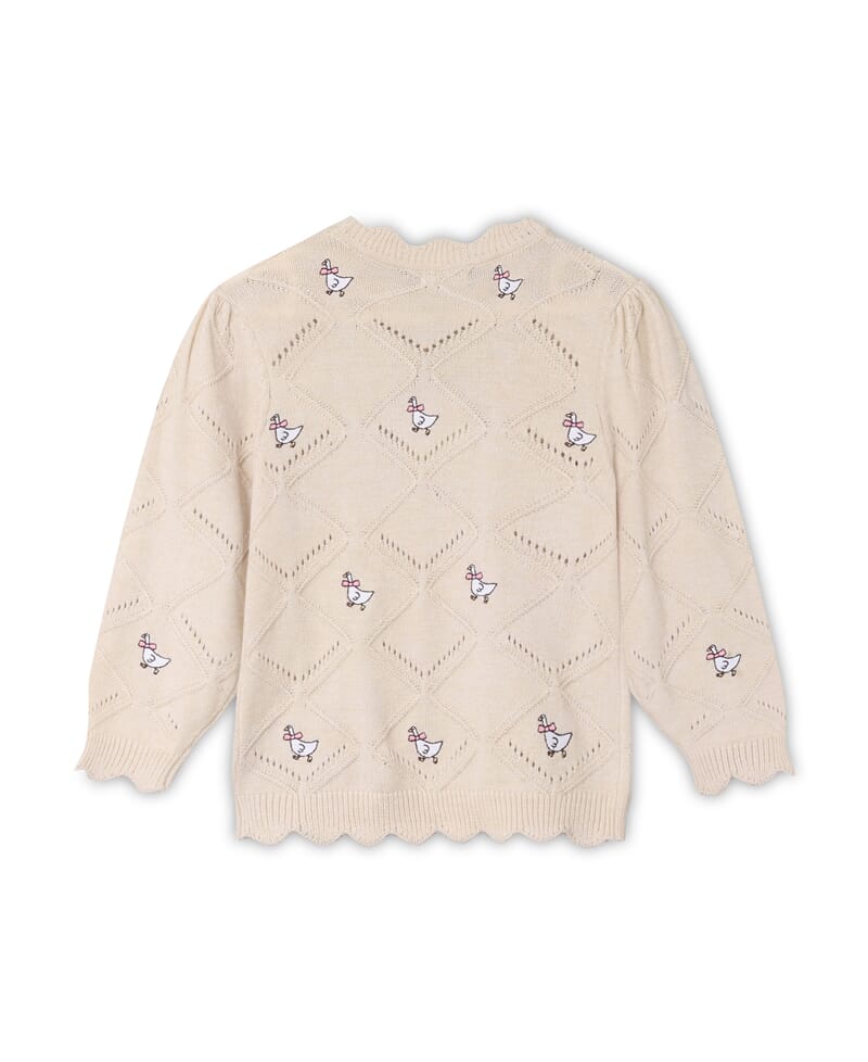 Genser i deilig myk strikk i viscose-kvalitet. Lekkert hullmønster og små gjess.