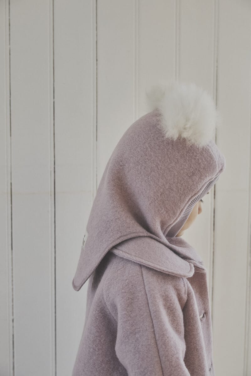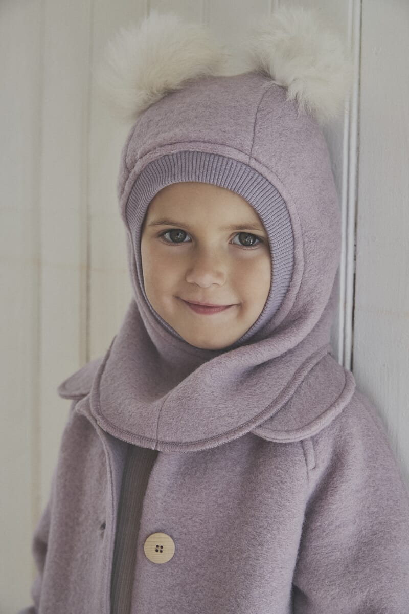 Lekker hjelmlue i god ullkvalitet. Mykt velour-fôr på innsiden. Rund hodeform og bred elastisk rib-kant i åpningen. Ekstra lengde i nakken for beskyttelse. Søte alpakka-pompomer på toppen, laget med pels fra alpakker i Bolivia. NB! Pompomene vil være unike og variere i størrelse og farge.